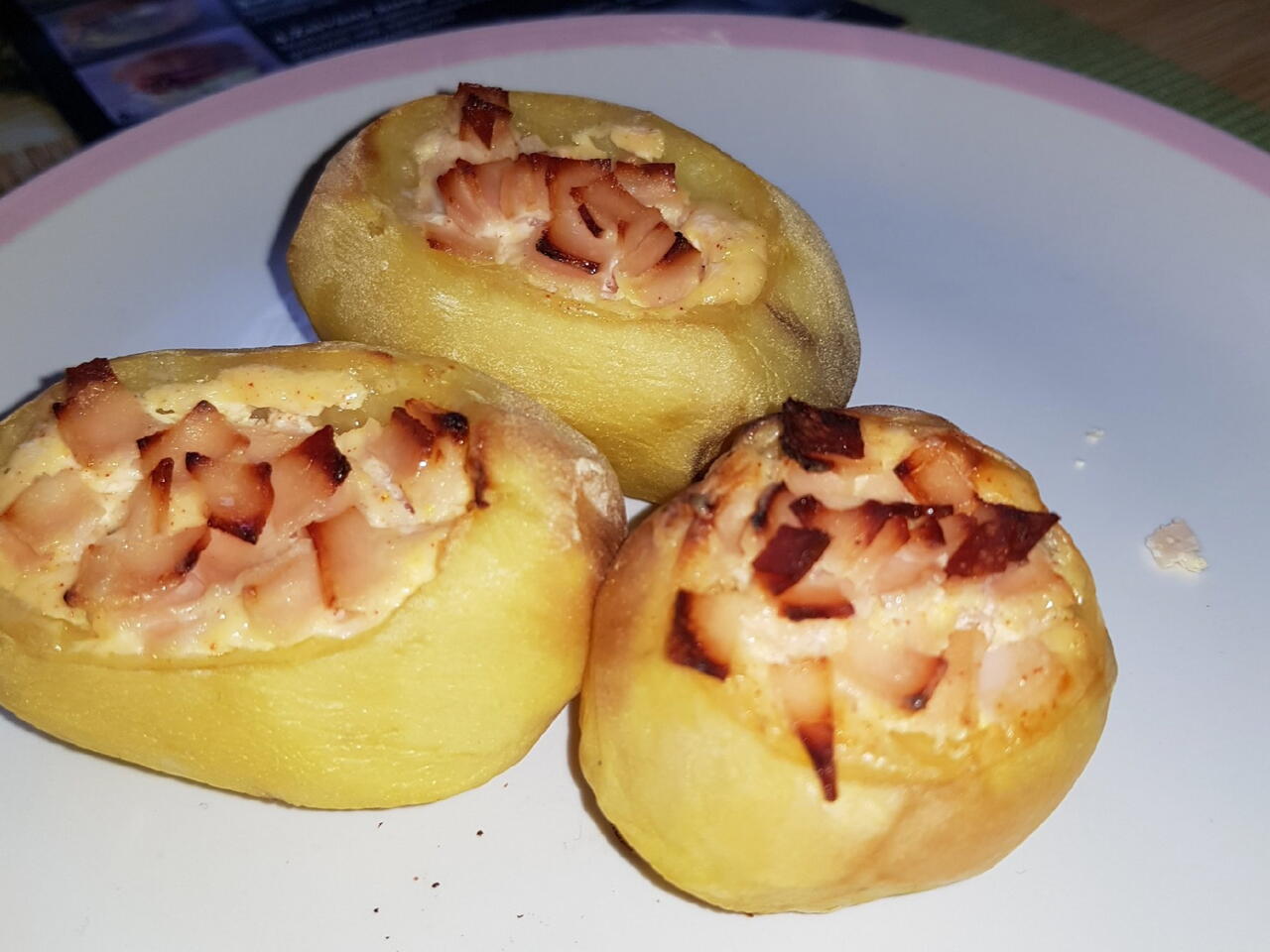 Sütőt előmelegítjük kicsit, ameddig melegszik a burgonyákat megtöltjük a tejfölös szósszal és a maradék felvágottat szépen elszorjuk a tetején. (Sajtot is lehet rá tenni, attól csak finomabb lesz)