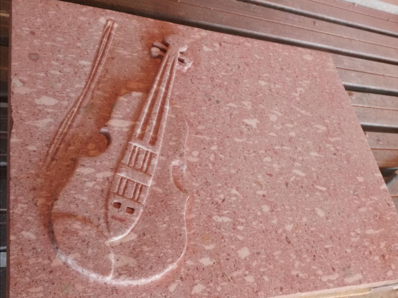 Organizzare una piastra di trachite rosa ,poi disegnare a matita la figura da scolpire e successivamente agire con scanalatura perimetrale.