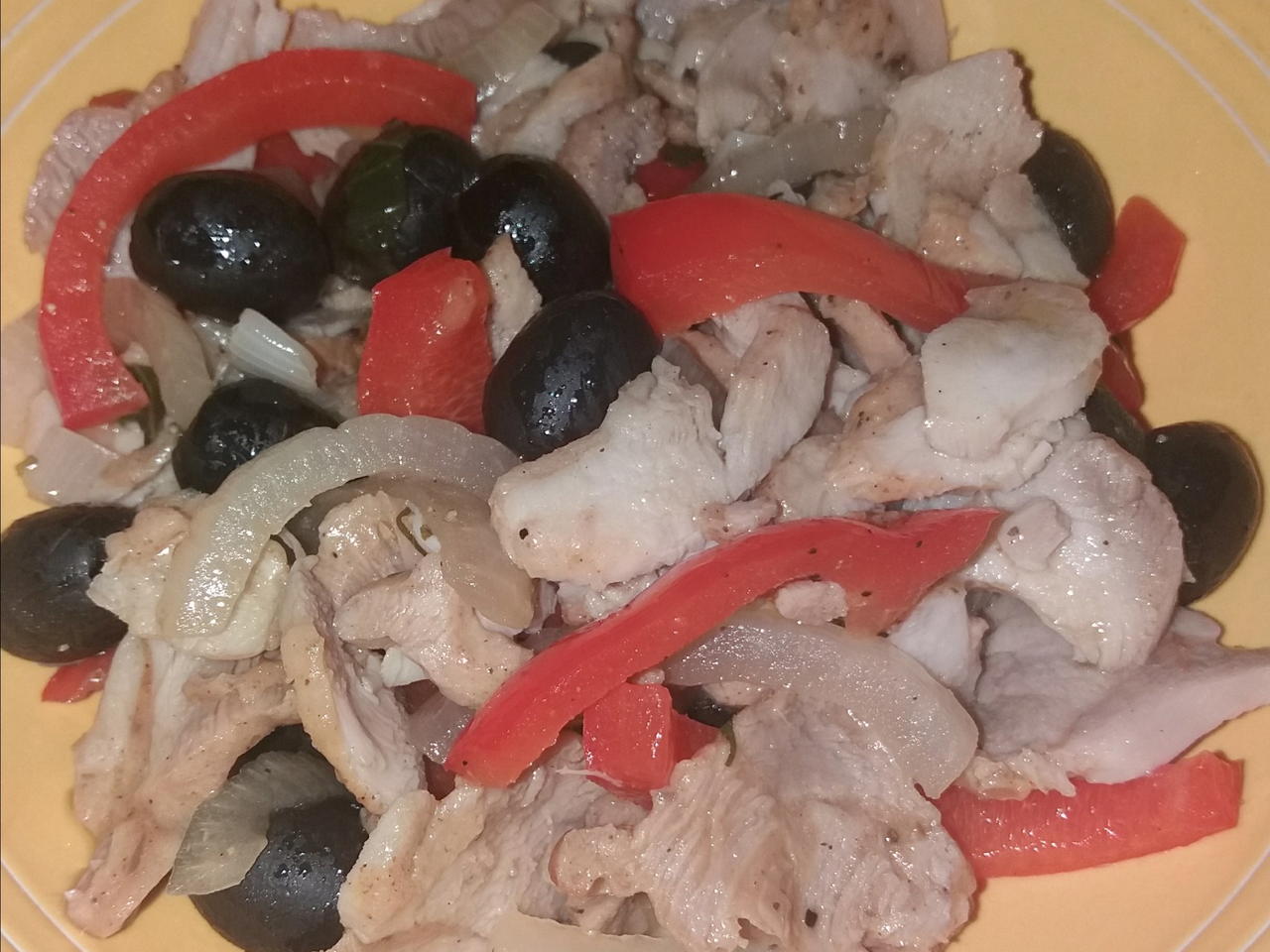 Miscelare in padella con un po' di olio di oliva extravergine i vari componenti : pezzi di peperone , cipolla , olive , basilico e qualchegranello di sale grosso...cucinare a fuoco basso...