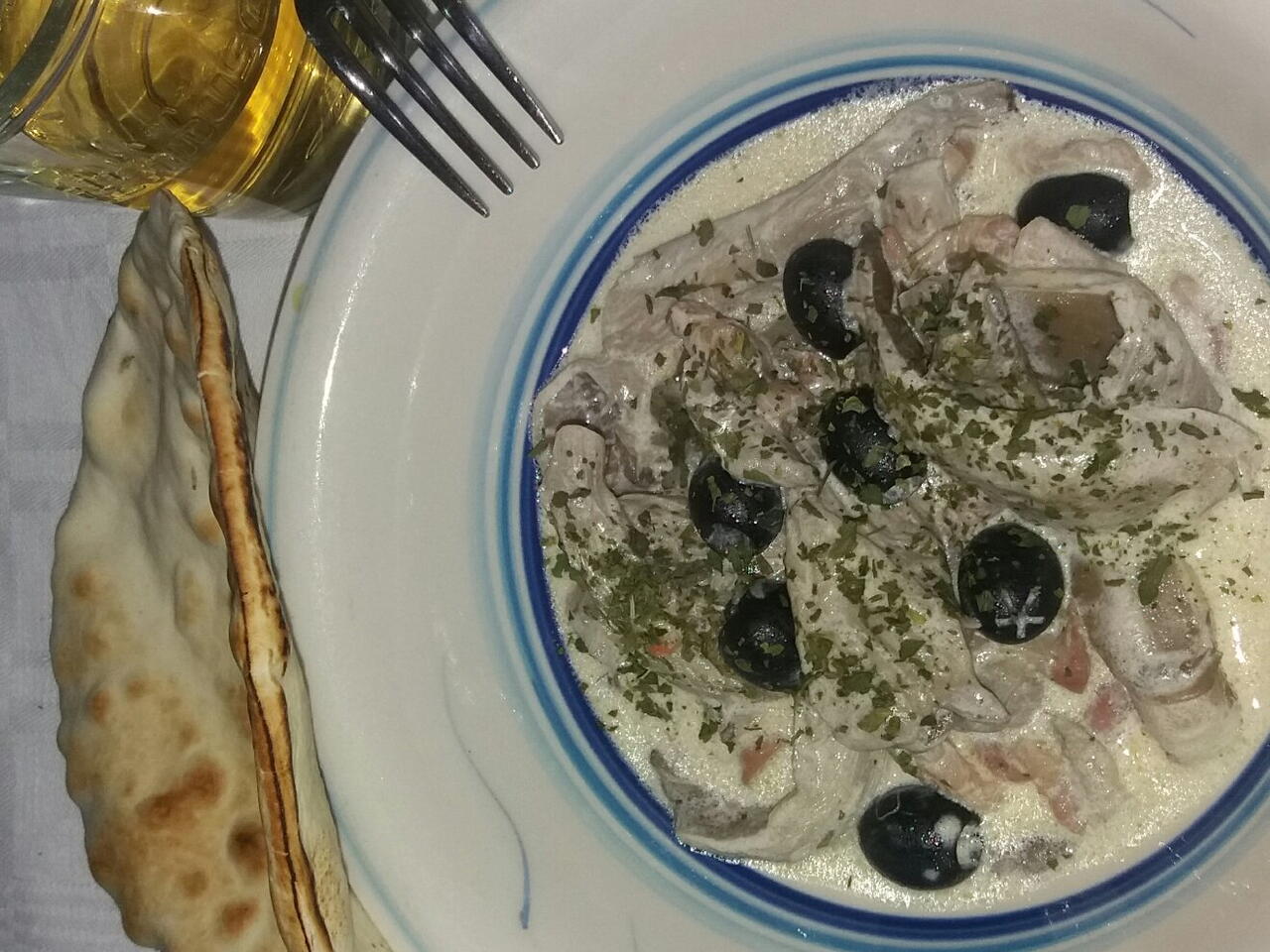 Ora che i funghi hanno levato l'acqua... aggiungere le olive , la pancetta e un pizzico di sale...