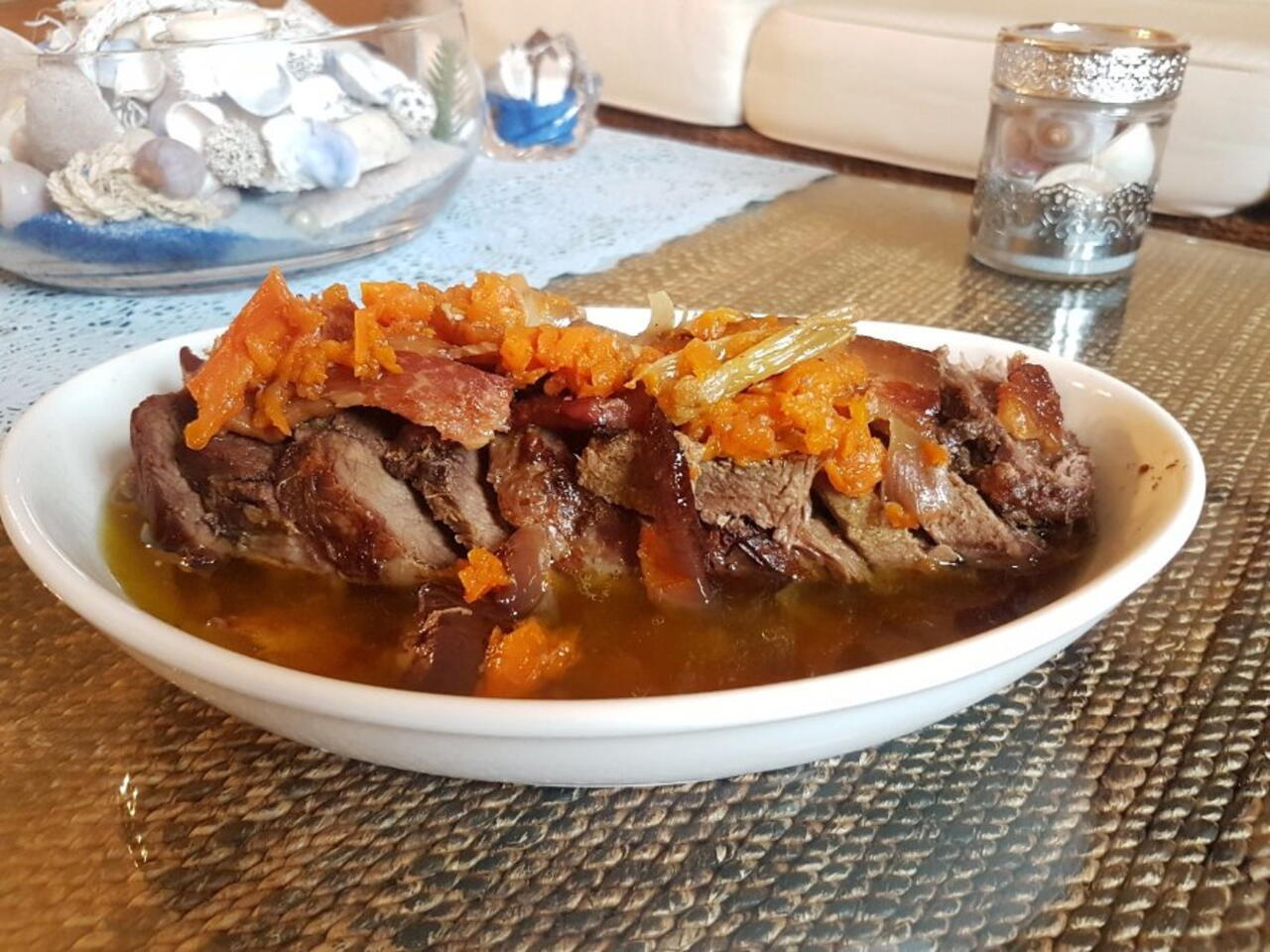 In un pentolino fai sciogliere il burro con le acciughe e cospargere sopra la carne, adagia il lardo sopra la carne e copre con della carta stagnola x proteggerla un po e ke nn venga stopposa...