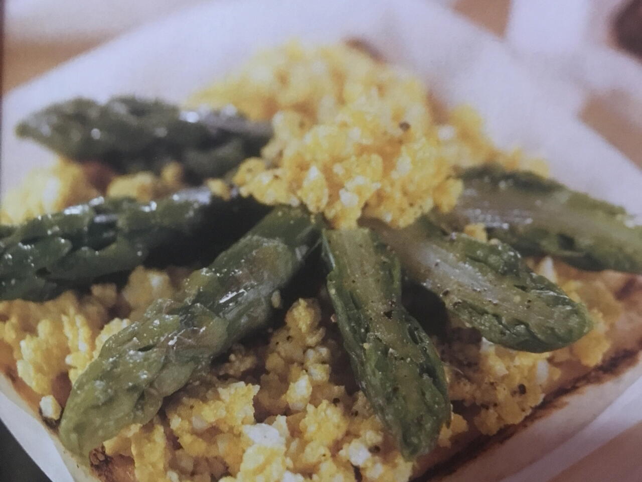 Tostate in forno le fette di pane, ungetele con il burro rimasto, distribuitevi sopra le uova strapazzate e su queste adagiate le punte di asparagi. Pepate e servite