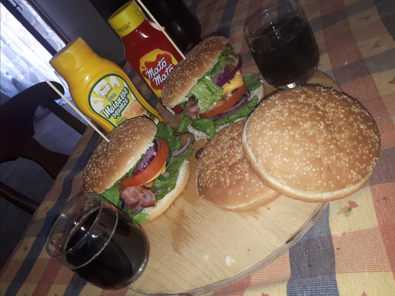 Tagliare il panino in due.. mettere in ordine gli ingredienti: Lattuga, Pomodoro, Cipolla, Hamburgher con sopra il cheddar, di nuovo cipolla, pomodoro, lattuga.. sopra la lattuga in cima mettete le salse che piรน vi ispirano.. io ho messo la maionese e la salsa.. fissare bene con un grande stuzzicadenti tipo quelli che si usano per gli spiedini ๐๐Buona cena..