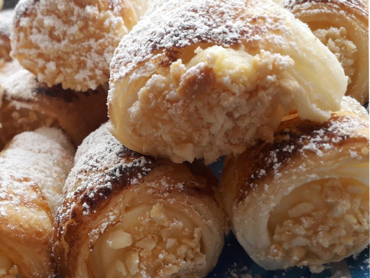 Mescolare bene il tutto con la frusta finchè la crema non diventa densa e omogenea. Una volta che la crema è pronta, trasferirla in una ciotola, coprire con la pellicola trasparente e lasciare raffreddare. (Appoggiare la pellicola trasparente sulla crema per far si che non si crea la crosta.) Prendere la pasta sfoglia e tagliarla a strisce.