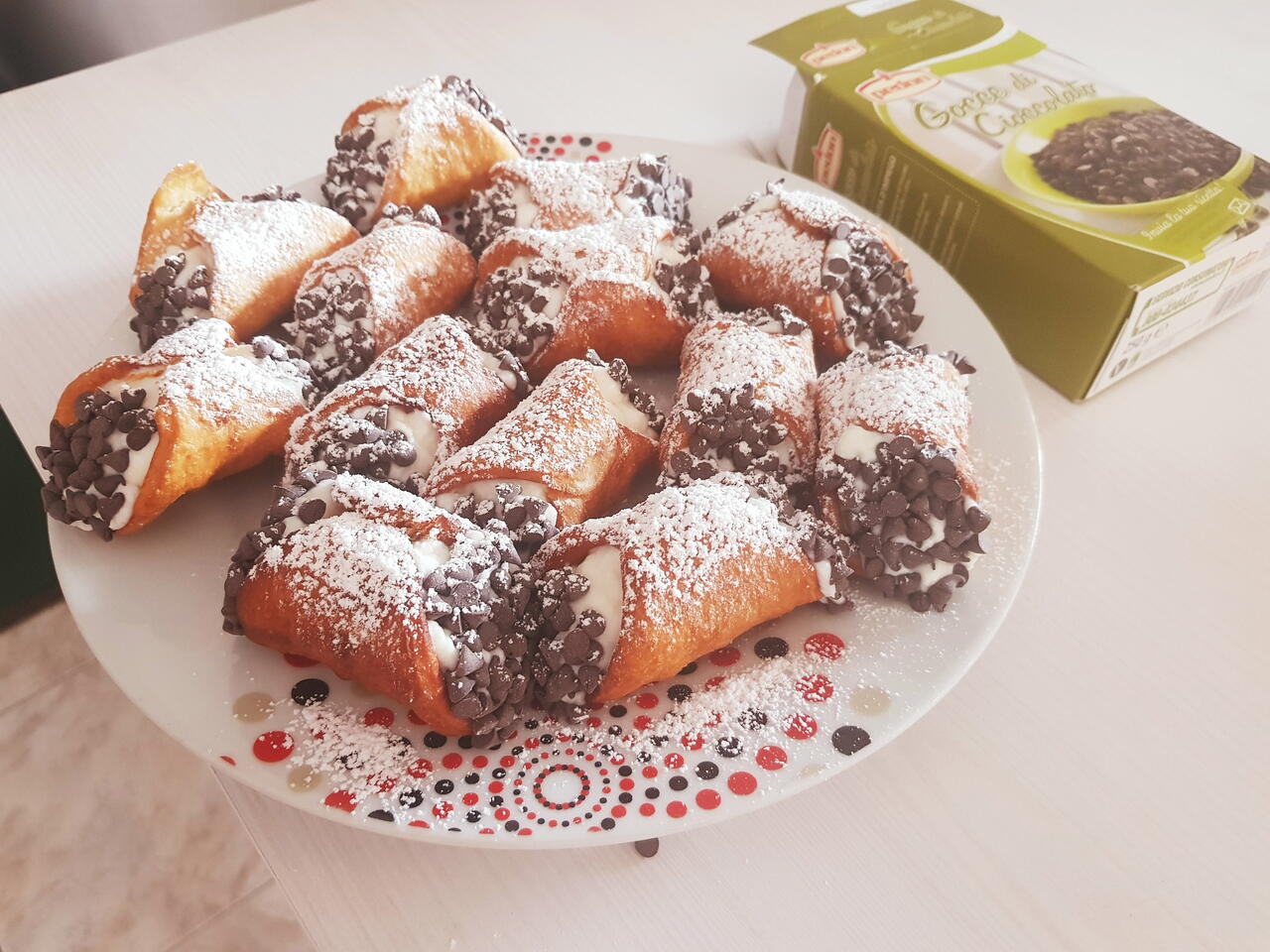 Le cialde di cannolo vanno farcite con la crema di ricotta solo al momento di servirle, guarnire a piacere.