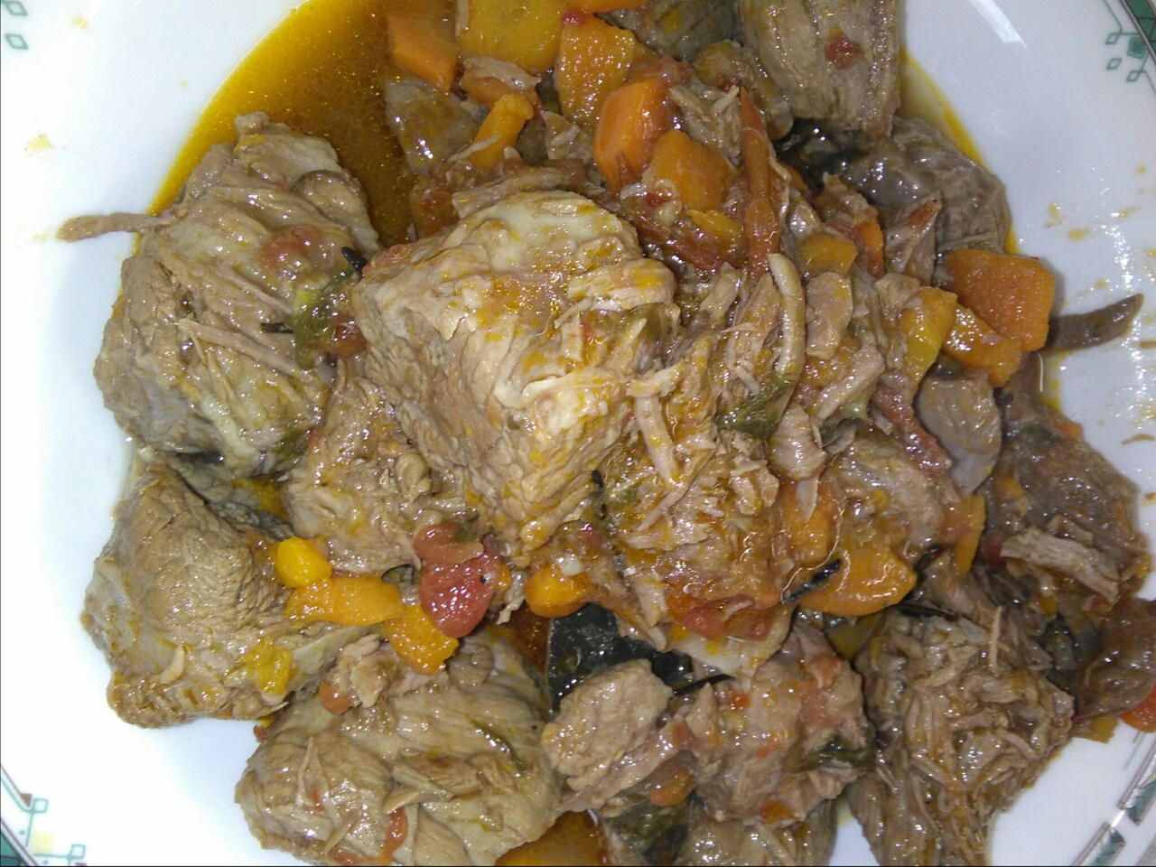 Lavare la carne tagliata a pezzetti e disporla in una pentola. Aggiungere sale, olio, i pomodori e le carote, la noce moscata e tutti gli ingredienti sopra indicati.