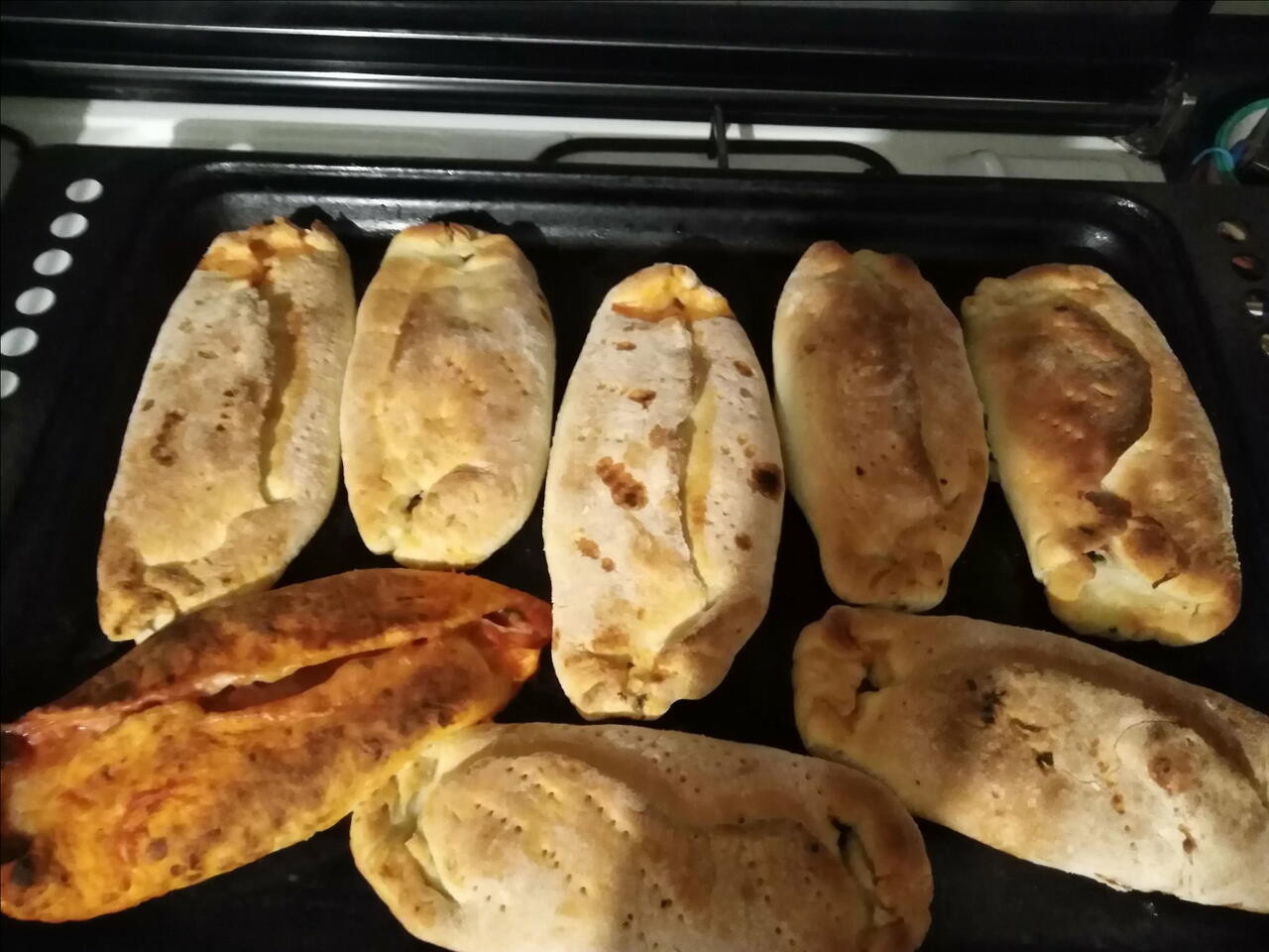 Tagliare l'impasto a pezzetti e fare delle palline e modellarli con il mattarello.Aggiungere prosciutto, olive nere,mozzarella,passata di pomodoro e spinaci.In una teglia aggiungere l'olio e metterli in forno a 200.