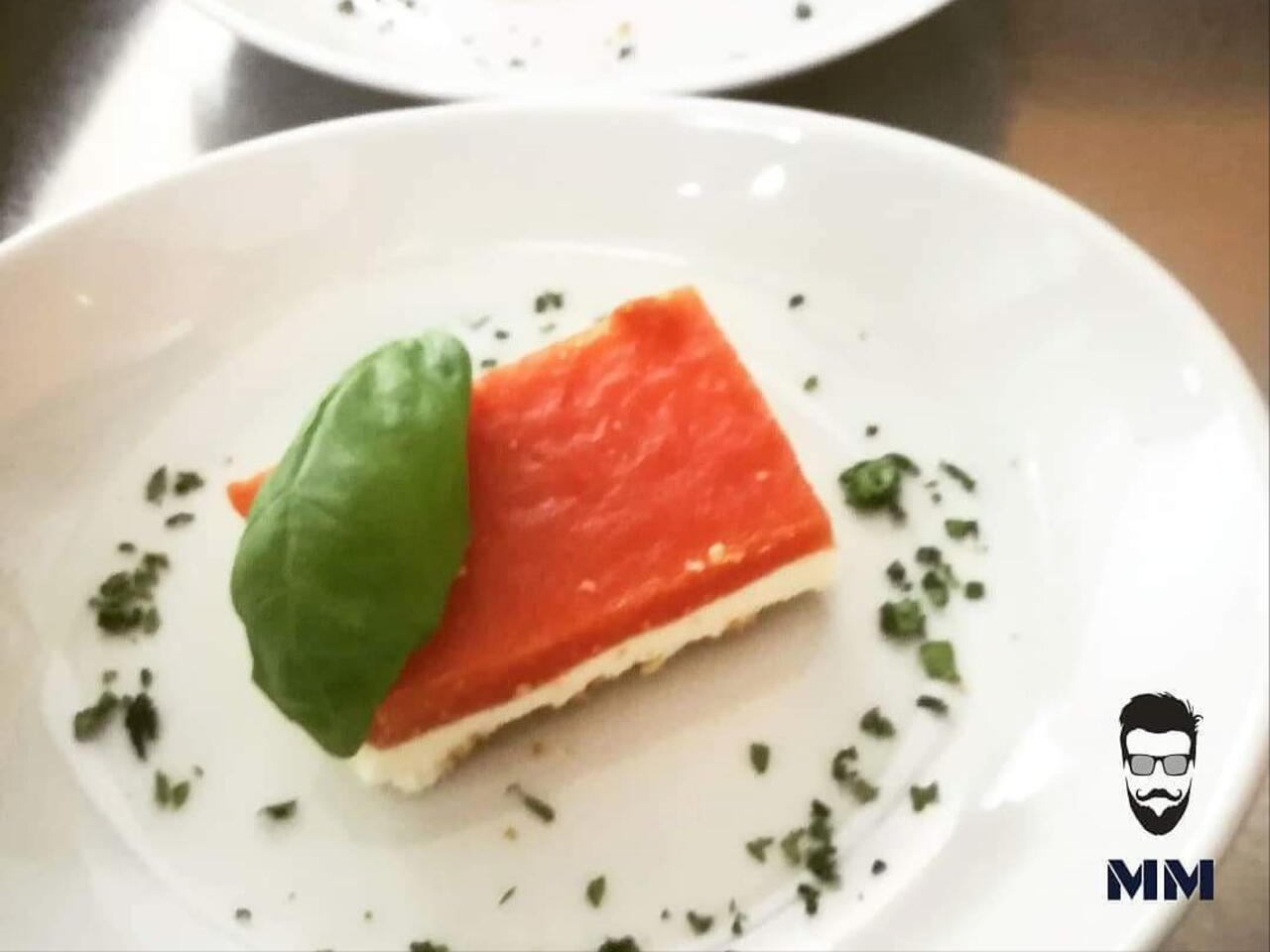Comporre il piatto come segue: - primo strato di taralli (compattarli) - secondo strato crema al formaggio (l'altezza dello strato รจ a piacere) - terzo strato gelรฉe ai pomodori e basilico