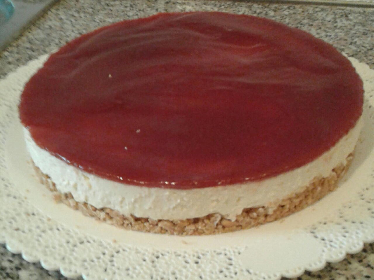 Scaldare la marmellata con il pezzetto di gelatina e farcire la cheesecake.Tenerla ancora in frigo un paio d'ore.