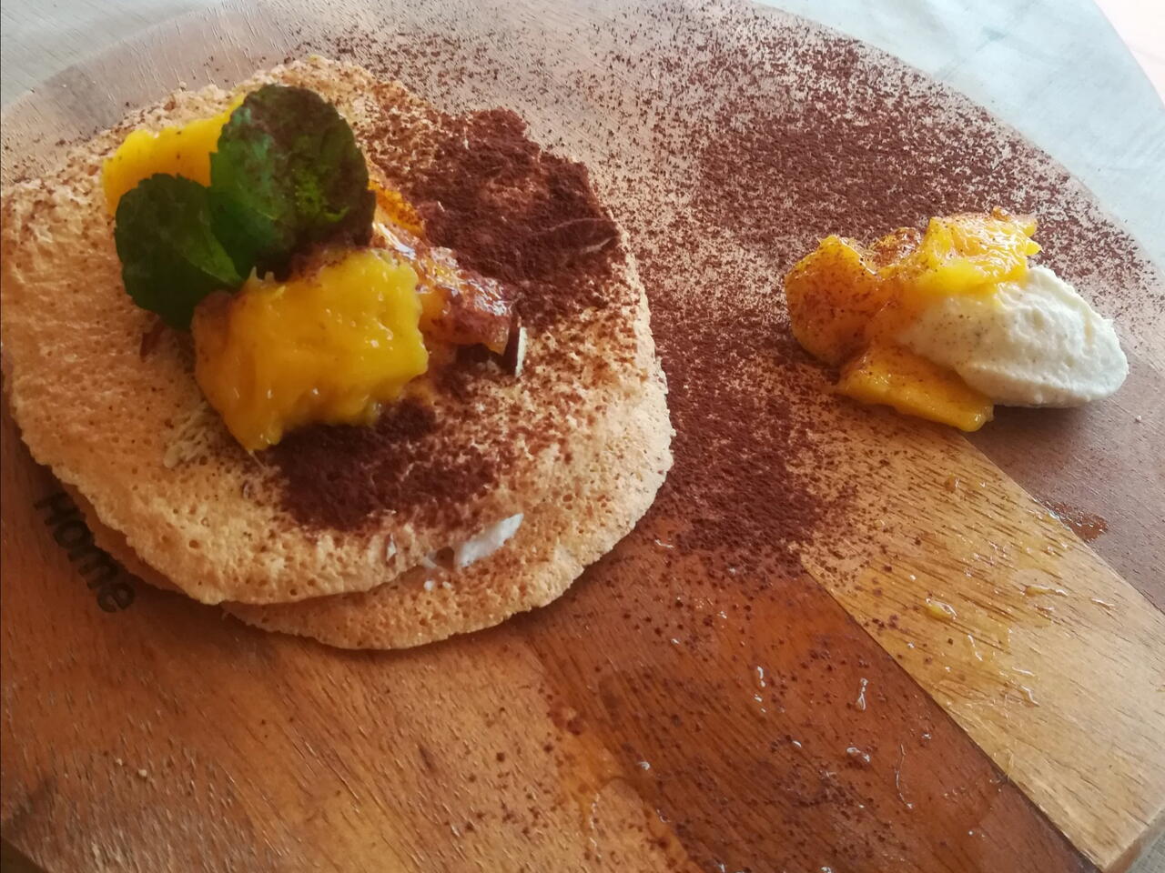 Cialde Con Crema di Ricotta Alla Menta, Mango e Cacao Amaro