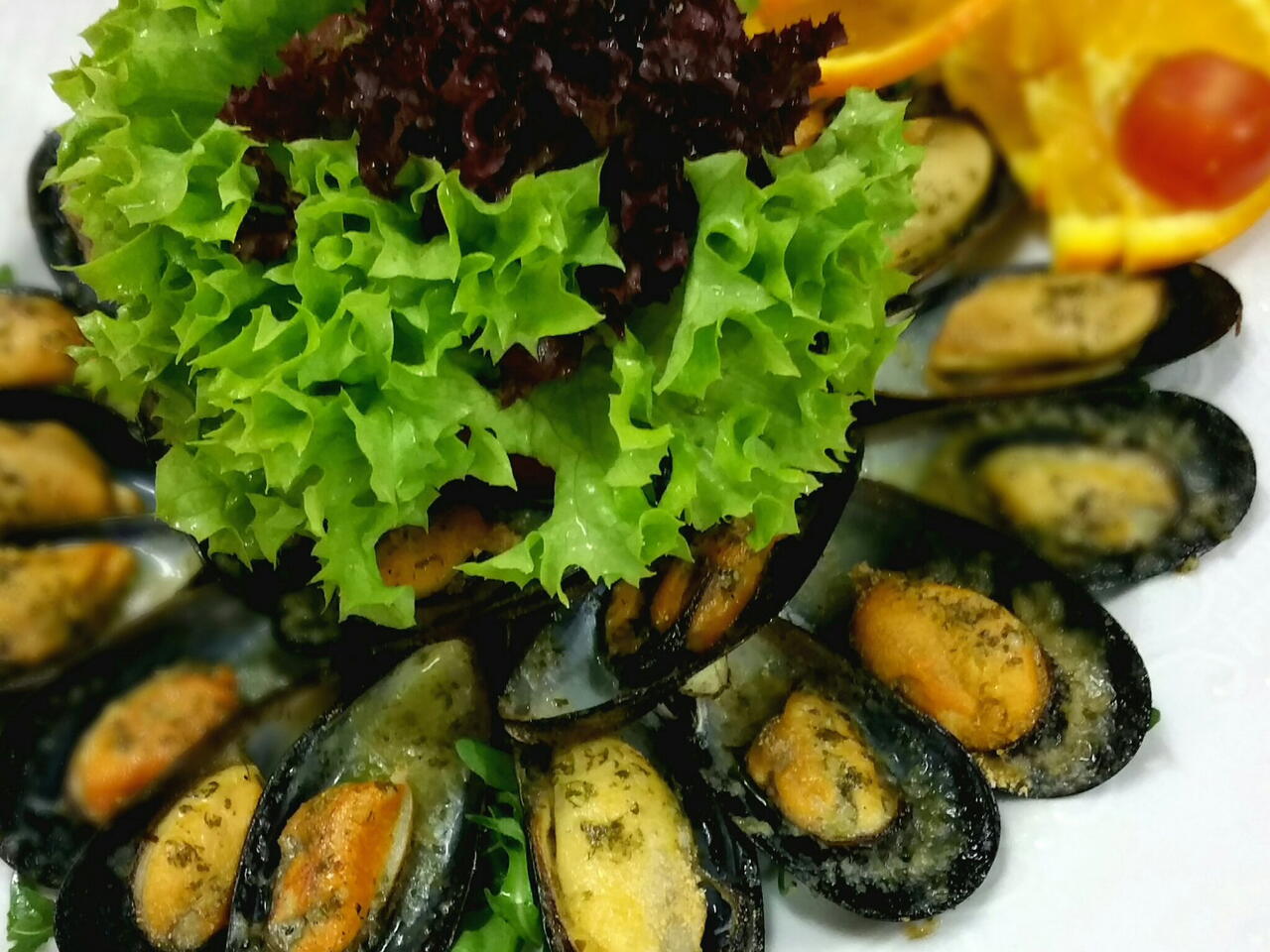 Impiattare e spremere succo di arancia senza esagerare sopra le cozze. Condire l'insalata posizionarla al centro con fette di arancia e pomodorini come ornamento e supporto alle cozze.