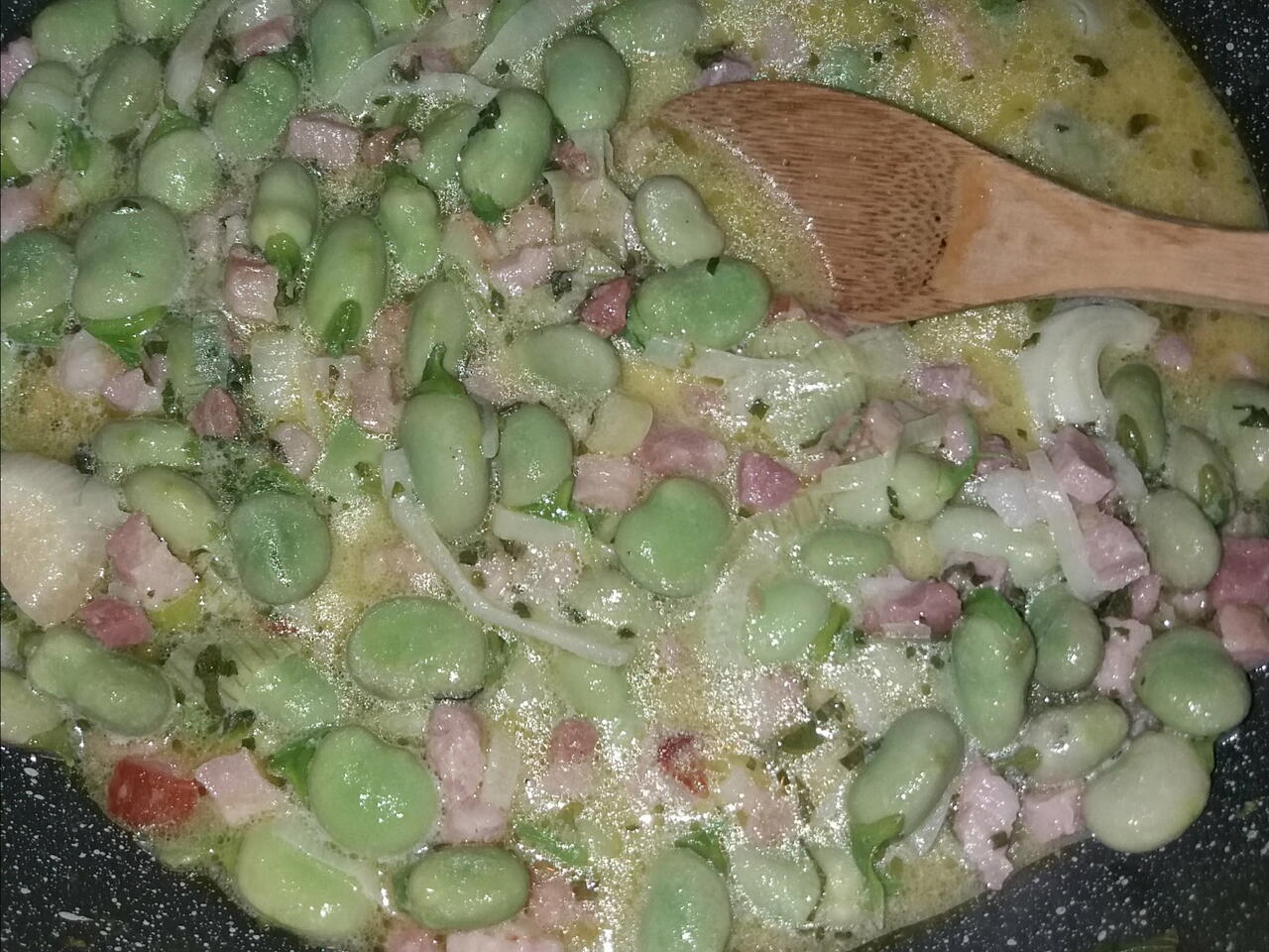 Aggiungiamo quindi un bicchiere di latte fresco che servirá per non far asciugare ed indurire le favette e copriamo il tegame...aumentiamo leggermente la fiamma e ricordiamoci di mescolare con un cucchiaio di legno per almeno 10 min.