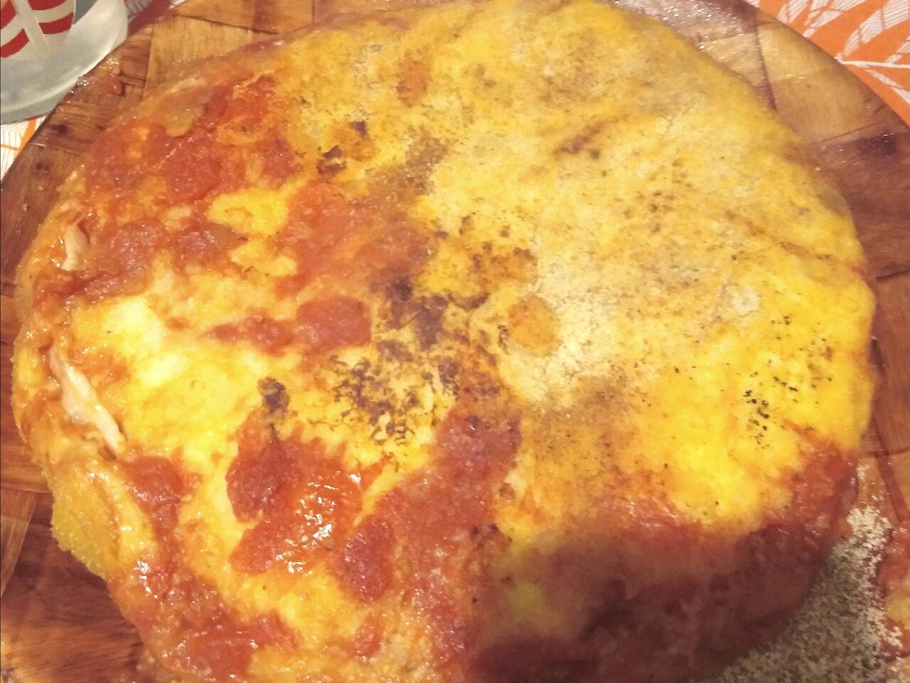 In una pentola antiaderente versiamo l'olio e cospargiamolo. Poi aggiungiamo il pangrattato e metΓ del composto di patate con prosciutto e il sugo pronto. Ricopriamo con il resto del composto di patate con pangrattato. Facciamo cuocere tutti e due i lati aiutandoci con un piatto per girare la nostra focaccia.(facciamo cuocere per 5 minuti a lato)