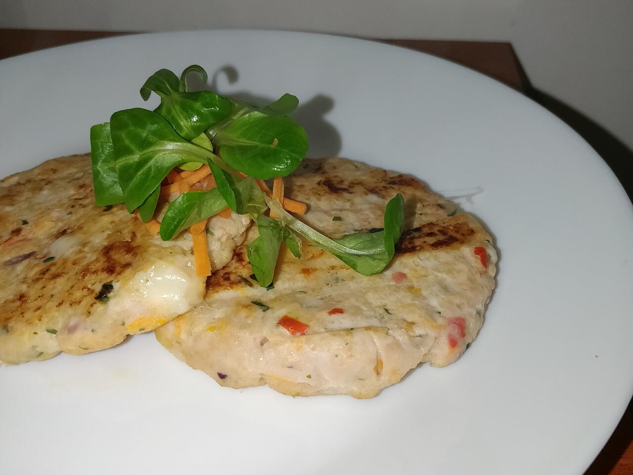 Formare un hamburger e accompagnare la carta da forno su di essa. Ritagliare gli eccessi. Cuocere in padella, 7 minuti circa a lato, a fuoco medio fino alla loro completa doratura. Poi servire con un pó di insalata fresca e carotine