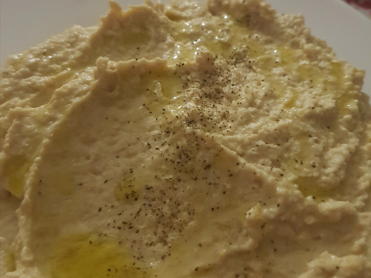 Mettere in un mixer un barattolo di ceci già cotti un cucchiaio di tahin e le spezie:pepe,sale e un pizzico di curry. Servire con un filo d'olio e un po' di pepe.
