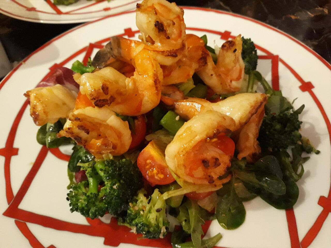 pulire gamberi e tagliarli per lungo fino alla coda. cuocere asparagi tagliati a pezzettini e broccoli. salvarli in una padella con olio d'oliva.Tagliare pomodorini in quattro,gratuggiare la carota. mettere tutti ingredienti in una ciotola e condire