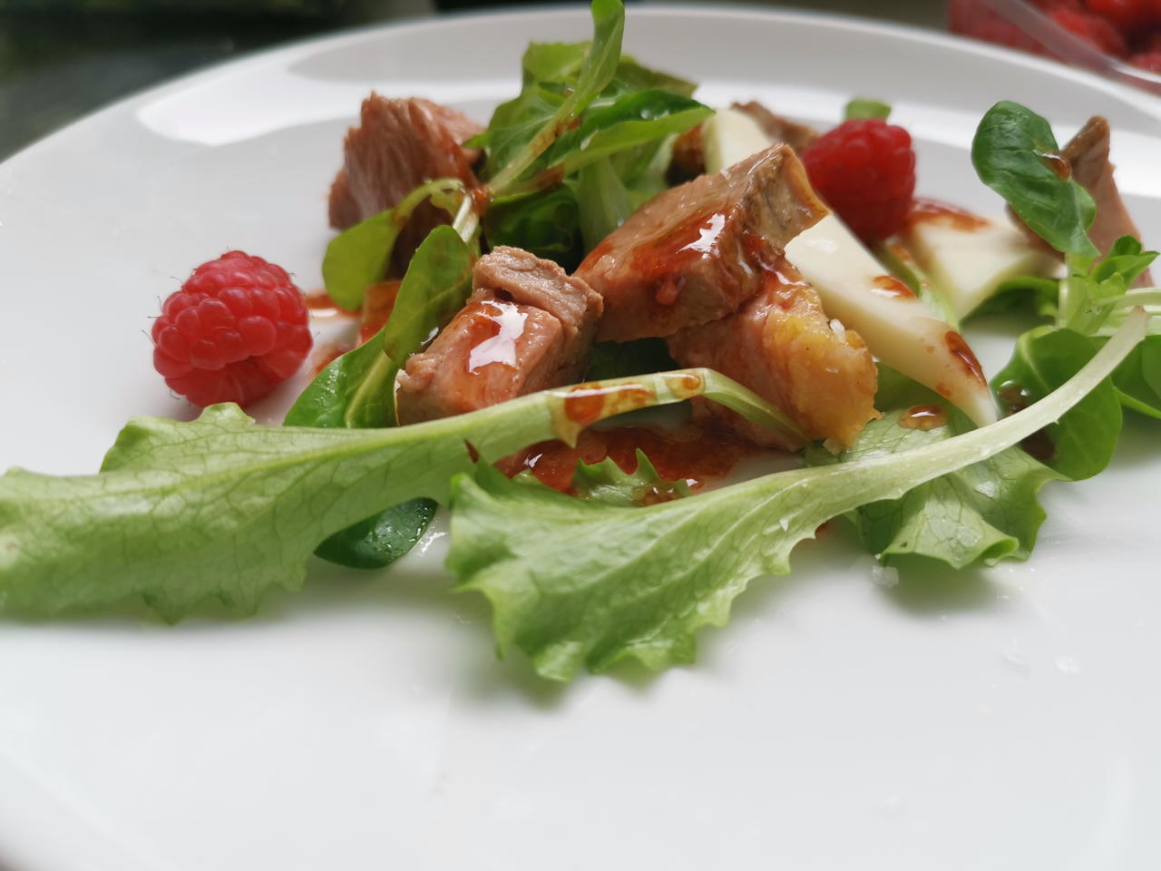 comporre il piatto con valeriana o lattuga, i cubetti di carne, il formaggio tagliato a triangoli e 1 o 2 lamponi.
