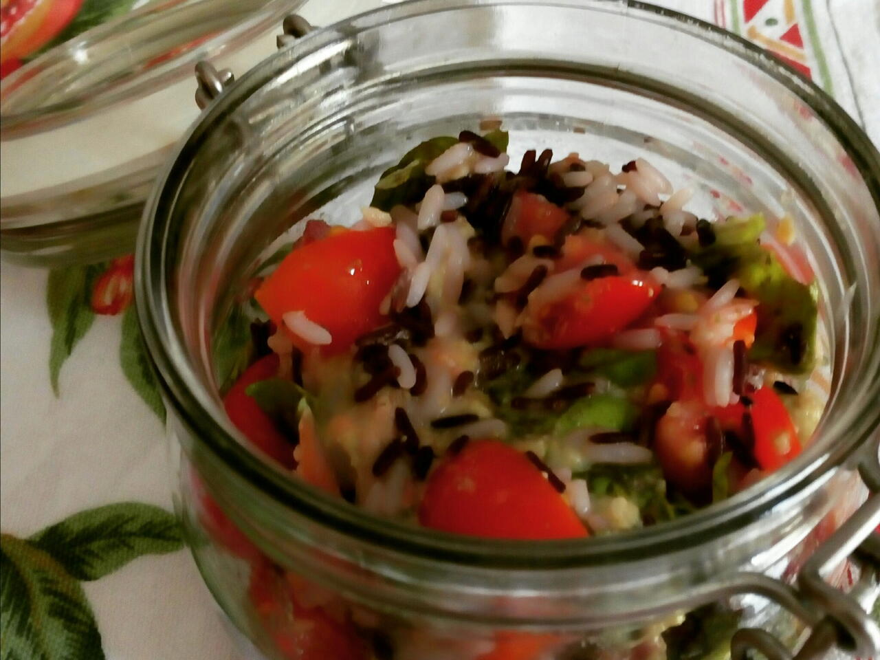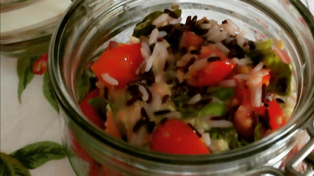 Trasferite l'insalata di riso Venere in un barattolo di vetro con chiusura ermetica e servite a tavola.