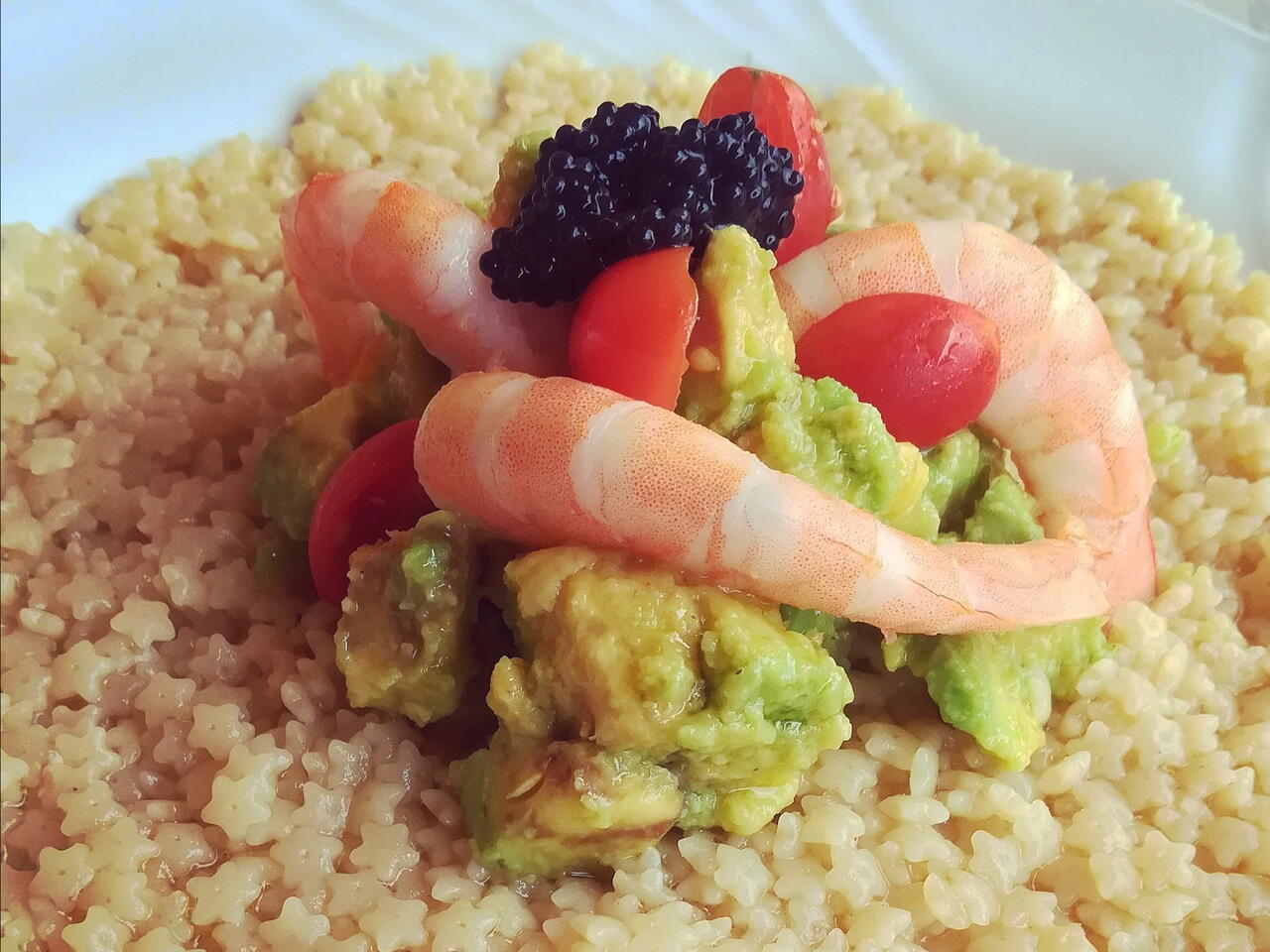 Servire il fondo di minestra con avocado, pomodorini e code di gambero