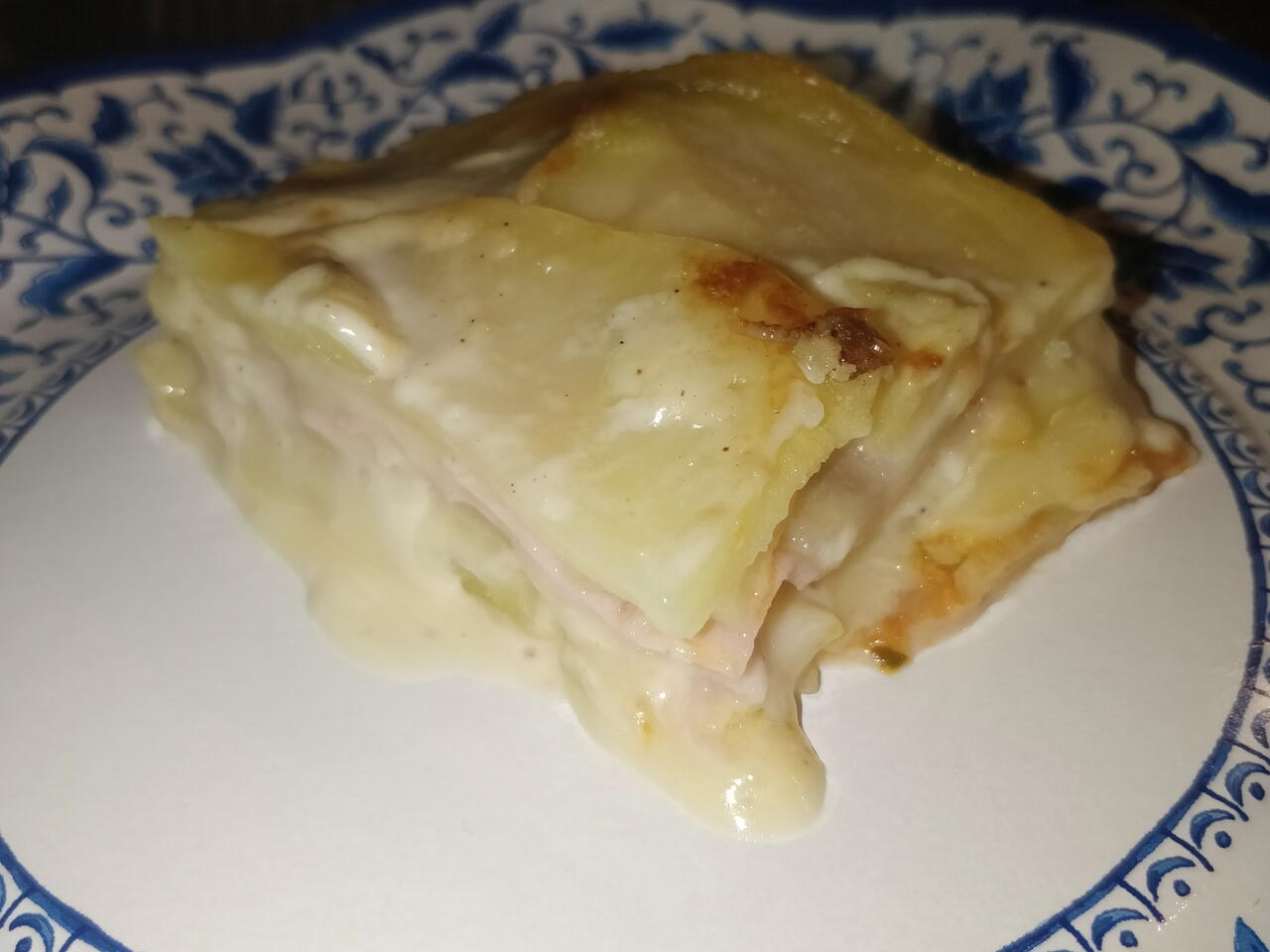 Poi di nuovo patate, sale, besciamella e così via. Terminando con uno strato di patate, besciamella e parmigiano