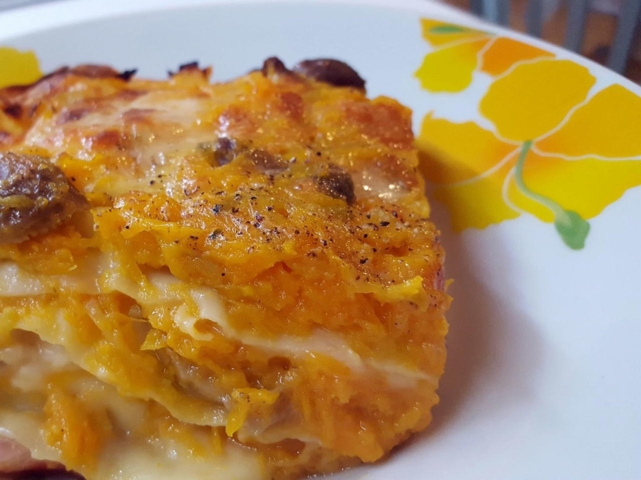 Versare un po di besciamella sul fondo della pirofila, e cominciare a formare gli strati alternando la pasta con la crema di zucca e funghi e il parmigiano.Completare con una spolverata abbondante di parmigiano e infornare a 180 ° per 20 min.
