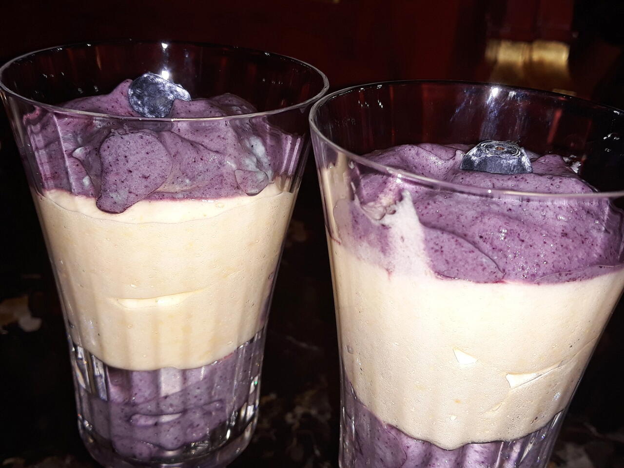 mescollare 2 purea di frutta con albumi montati in due recipienti e comporre dessert a stratti nel bicchiere.decorare con mirtilli