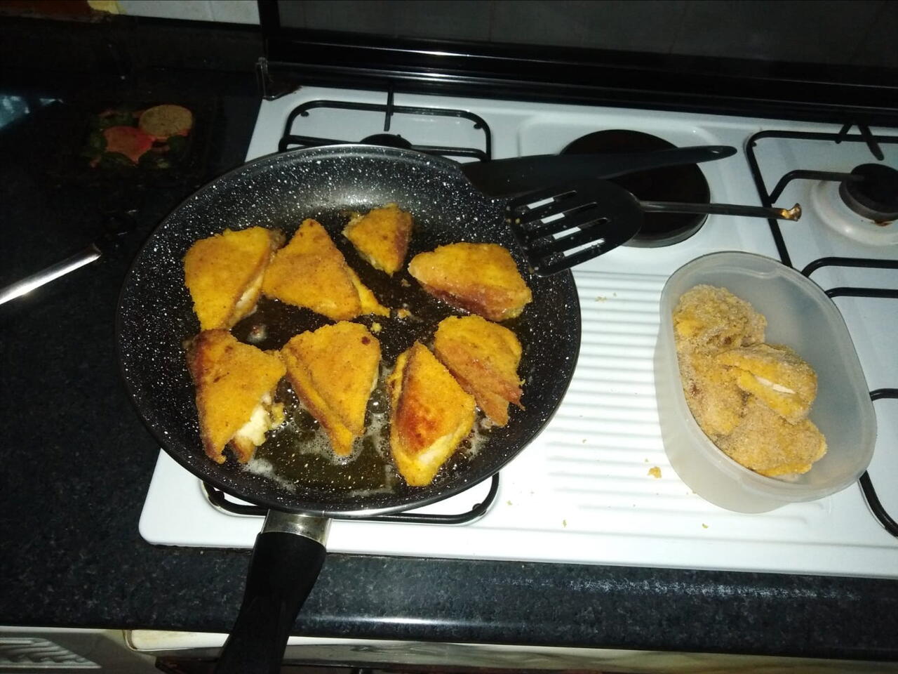 Mettere uno alla volta i triangoli nel composto girandoli in ambe due le parti e poi nel pangrattato sempre girendoli in ambe due le parti.