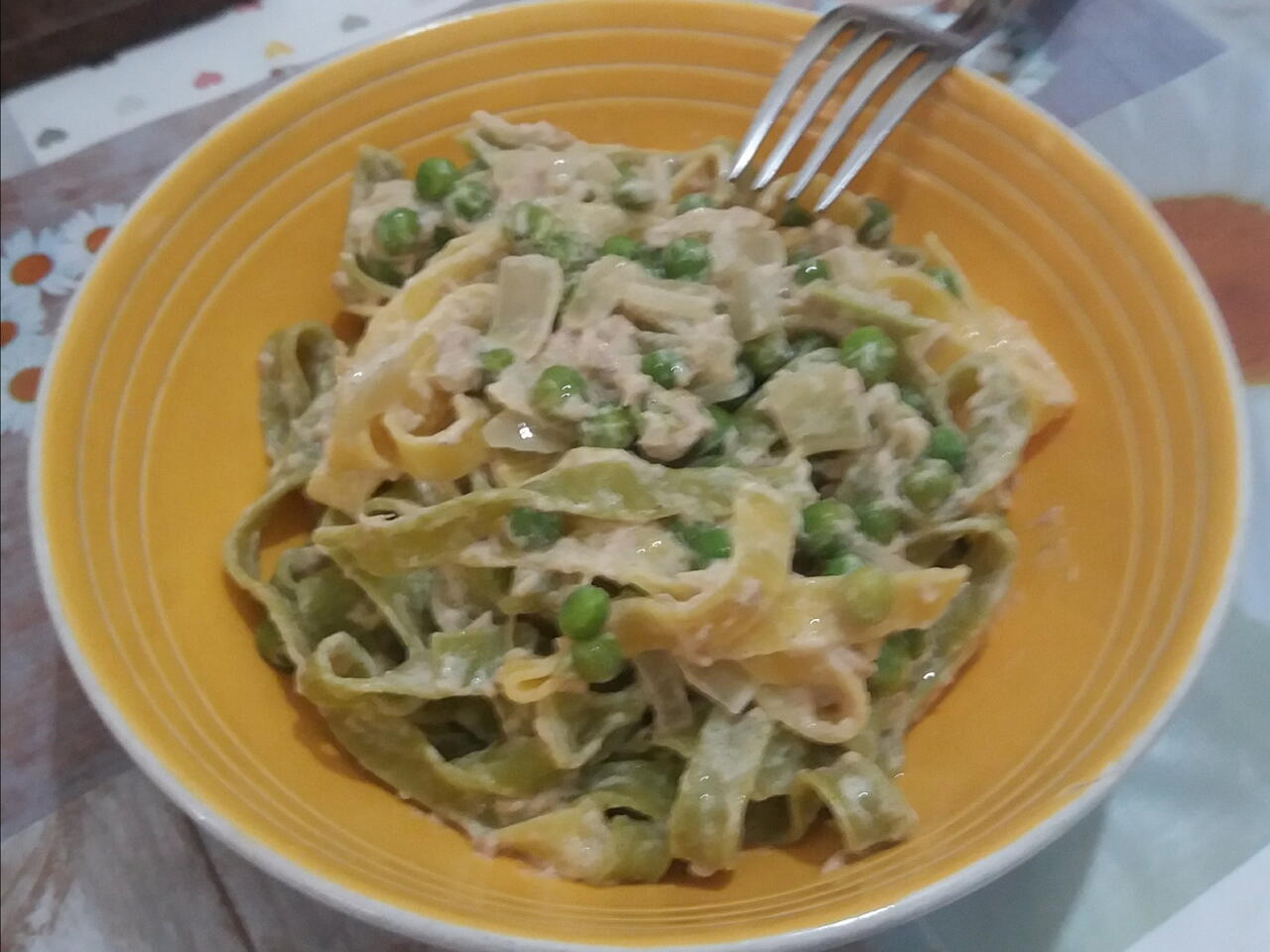 Giustamente dopo aver preparato il condimento ...soffriggere in una padella con 2 cucchiai di olio , mezza cipolla a pezzettini , aggiungere il tonno e i pisellini , qualche granello di sale grosso