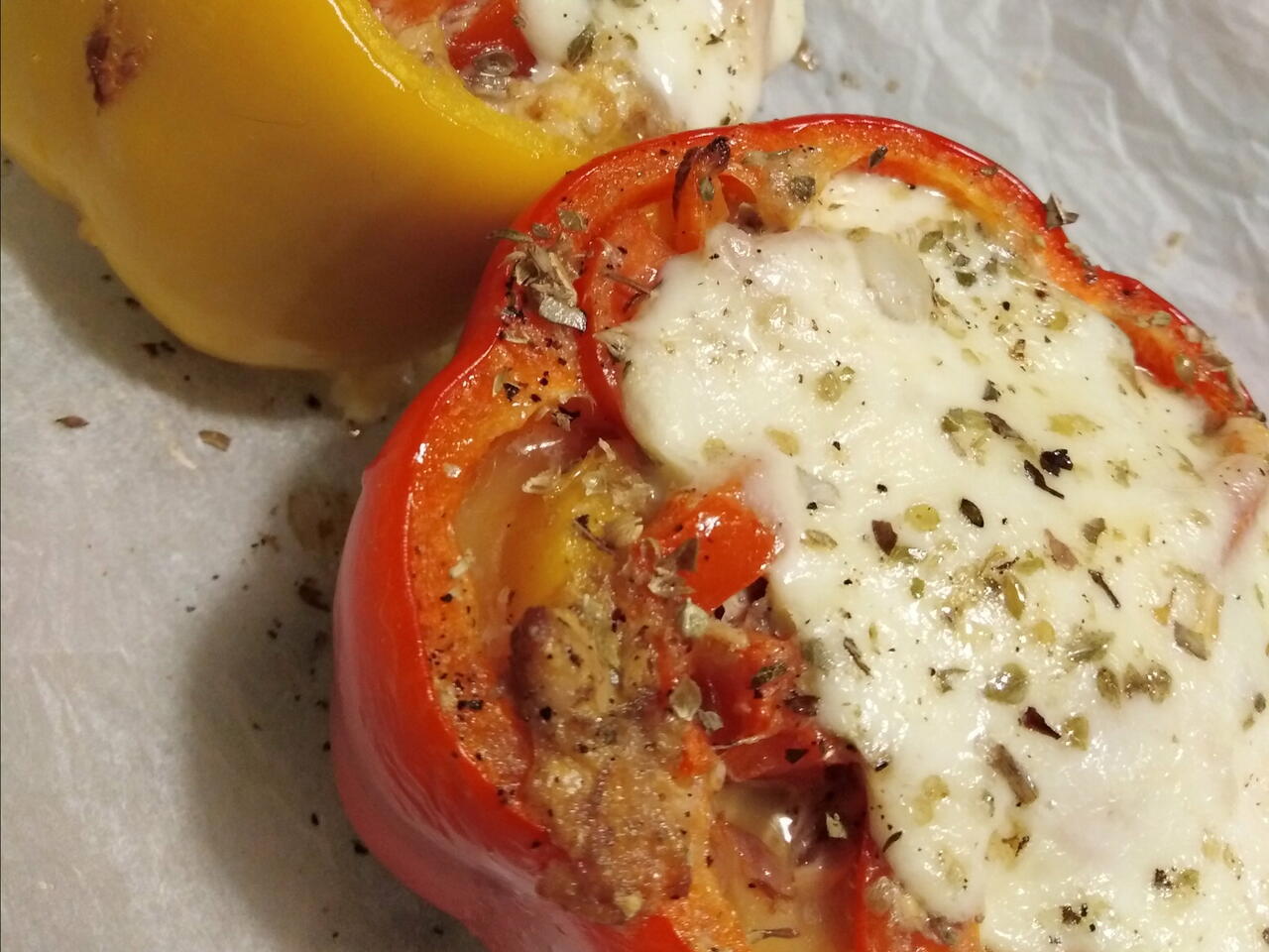 Dopo aver amalgamato bene il composto riempite i peperoni fino all orlo e adagiate sopra le fette di mozzarella tenute prima, aggiungete una spruzzata di origano e pepe e un filo d'olio. Infornate per circa 1h.