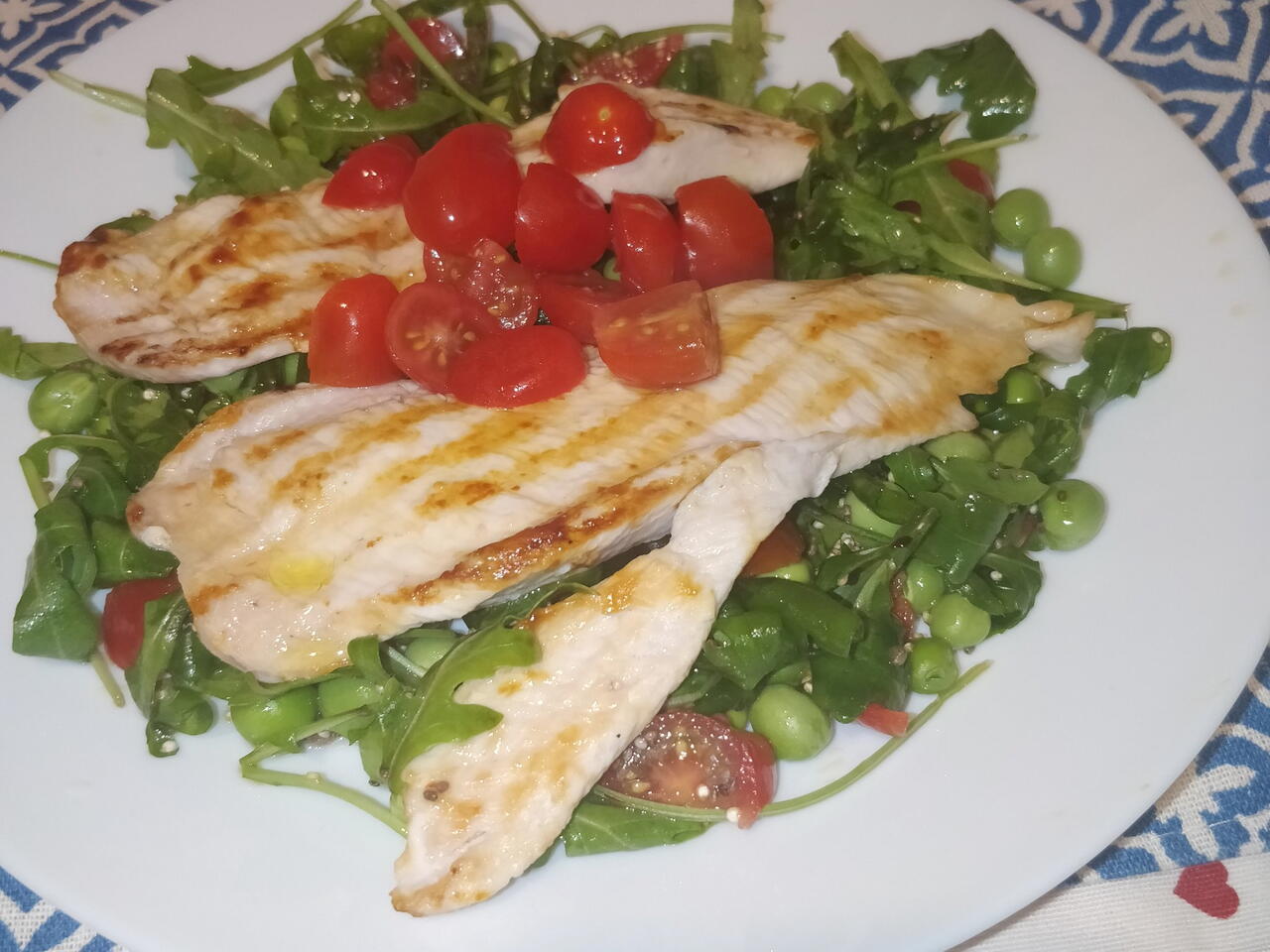 In un piatto mettere l'insalata condita e adagiare sopra le fette di pollo. Servire