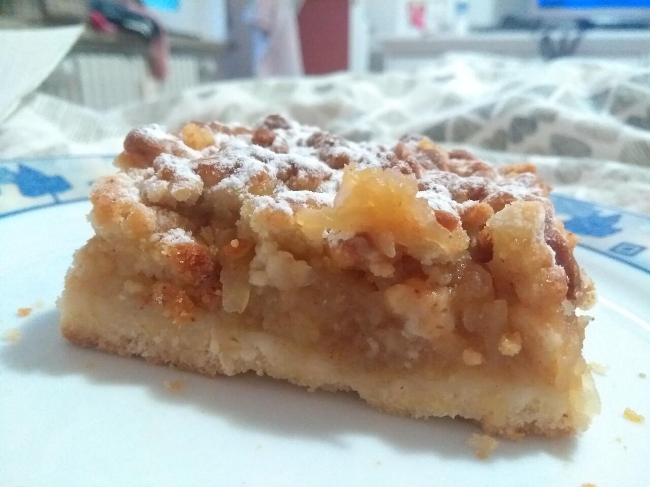 Nakon pola sata izvaditi tijesto iz frižidera i podijeliti na dva jednaka dijela. Prvi dio razvaljati i staviti na dno tepsije. Vjerojatno će pucati jer je mekano. Nemojte dodavati brašno. Lijepite dio po dio na dno tepsije. Na to staviti pripremljene jabuke. Drugi dio tijesta naribajte na jabuke, ali tako da je sve prekriveno tijestom.