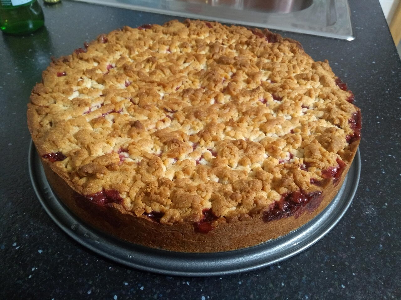 Tijesto treba umotati u foliju i staviti u frižider na pola sata.Nakon pola sata izvaditi tijesto iz frižidera i podijeliti na dva jednaka dijela. Prvi dio razvaljati i staviti na dno tepsije. Vjerojatno će pucati jer je mekano. Nemojte dodavati brašno. Lijepite dio po dio na dno tepsije. Na to staviti pripremljene višnje. Drugi dio tijesta naribajte na višnje, ali tako da je sve prekriveno tijestom.