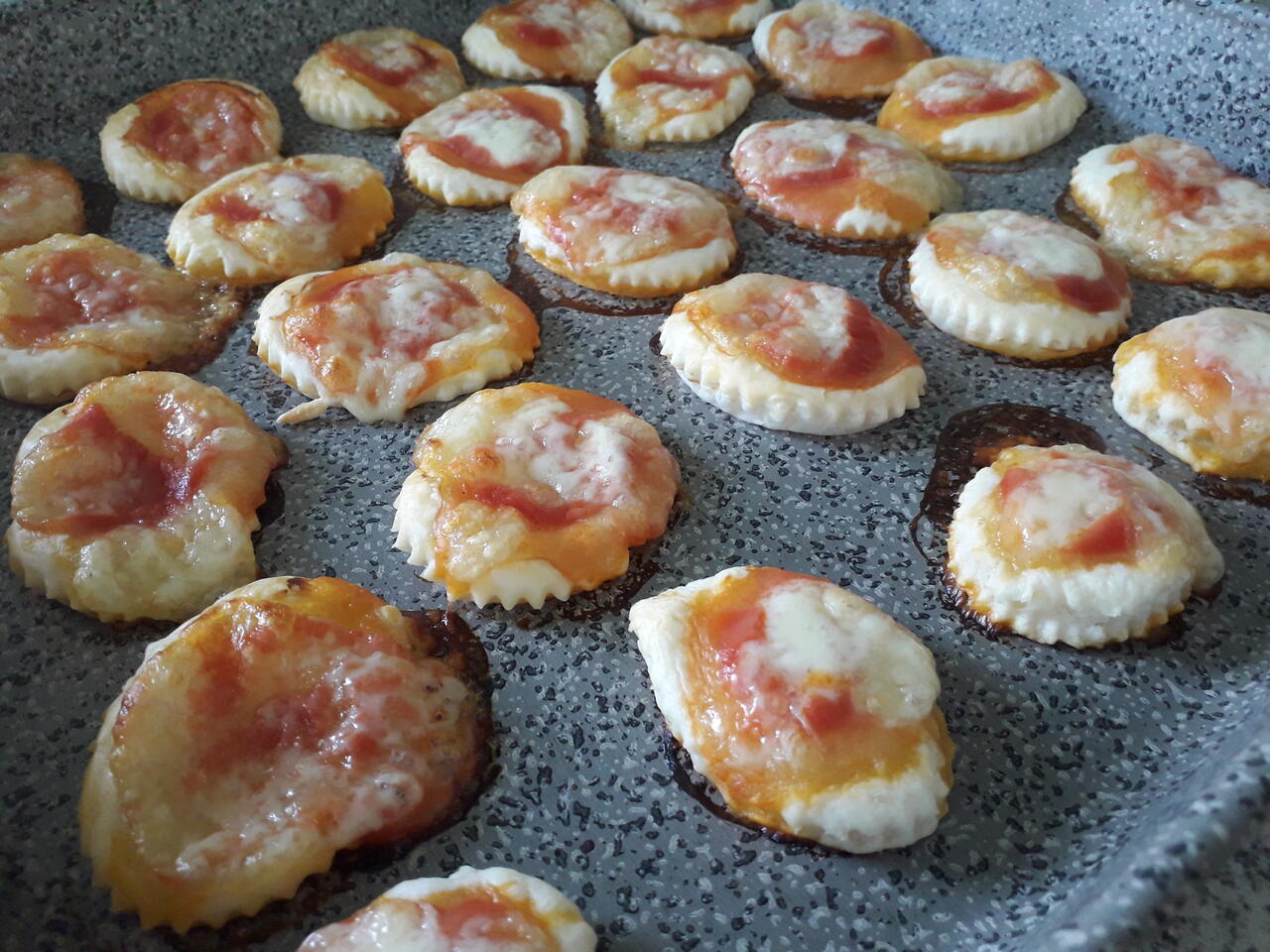 Metterli in una teglia anti aderente, su ogni cerchio mettere un cucchiaino di passato di pomodoro e cubetti di mozzarella. Infornare nel forno già caldo a 170° per 10 minuti. Servire caldo o freddo.