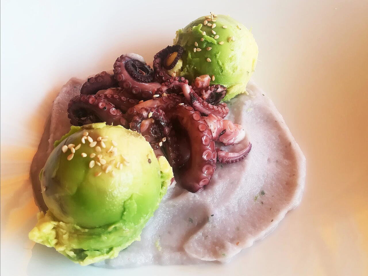 Polpo e Avocado Su Crema di Patate Viola Marinate Alle Erbe