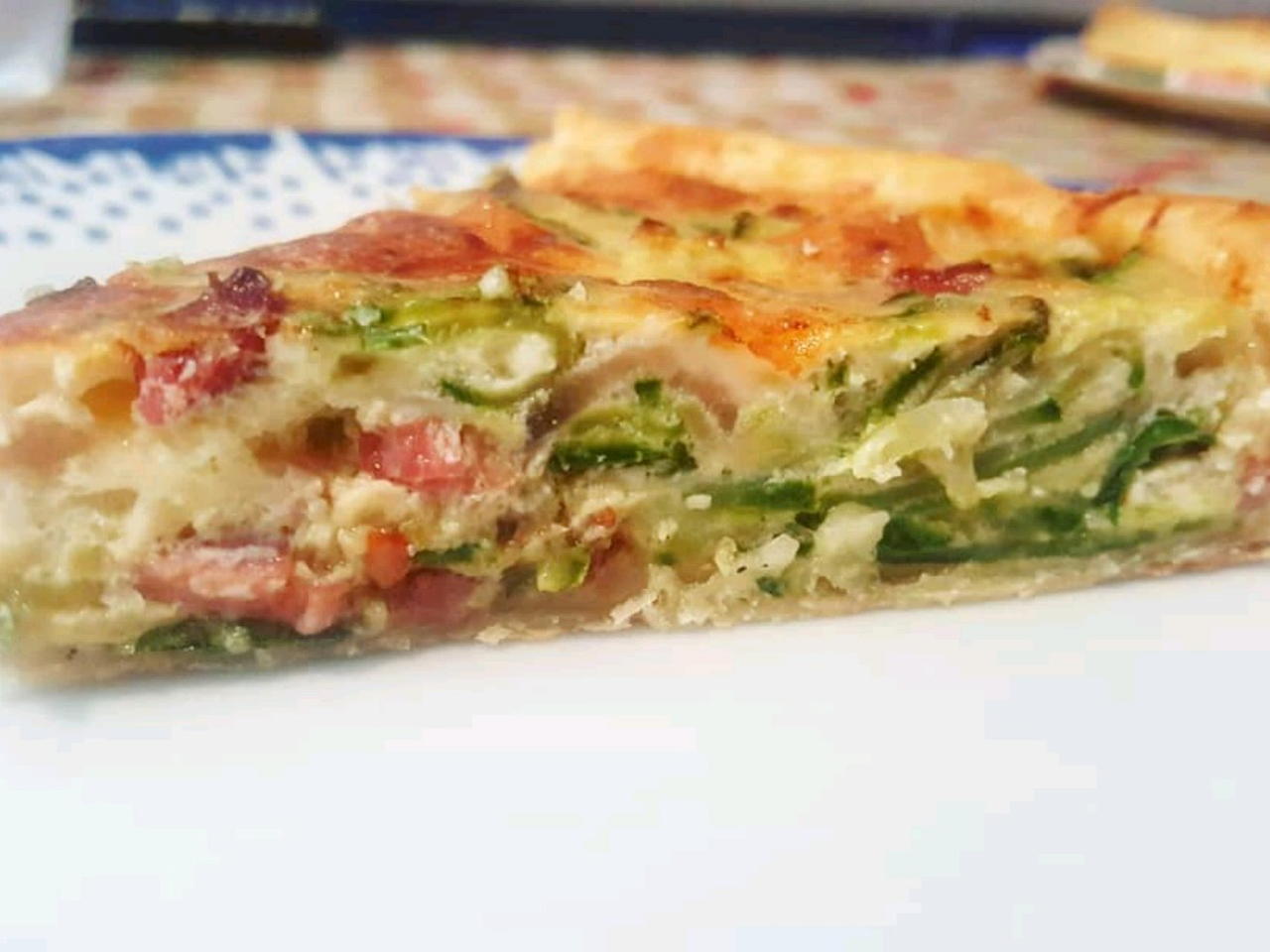 Una volta appassite le zucchine, mettere la pasta sfoglia nella tortiera,a aggiungere le zucchine con lo speck e l'amalgama d'uovo, panna e parmigiano