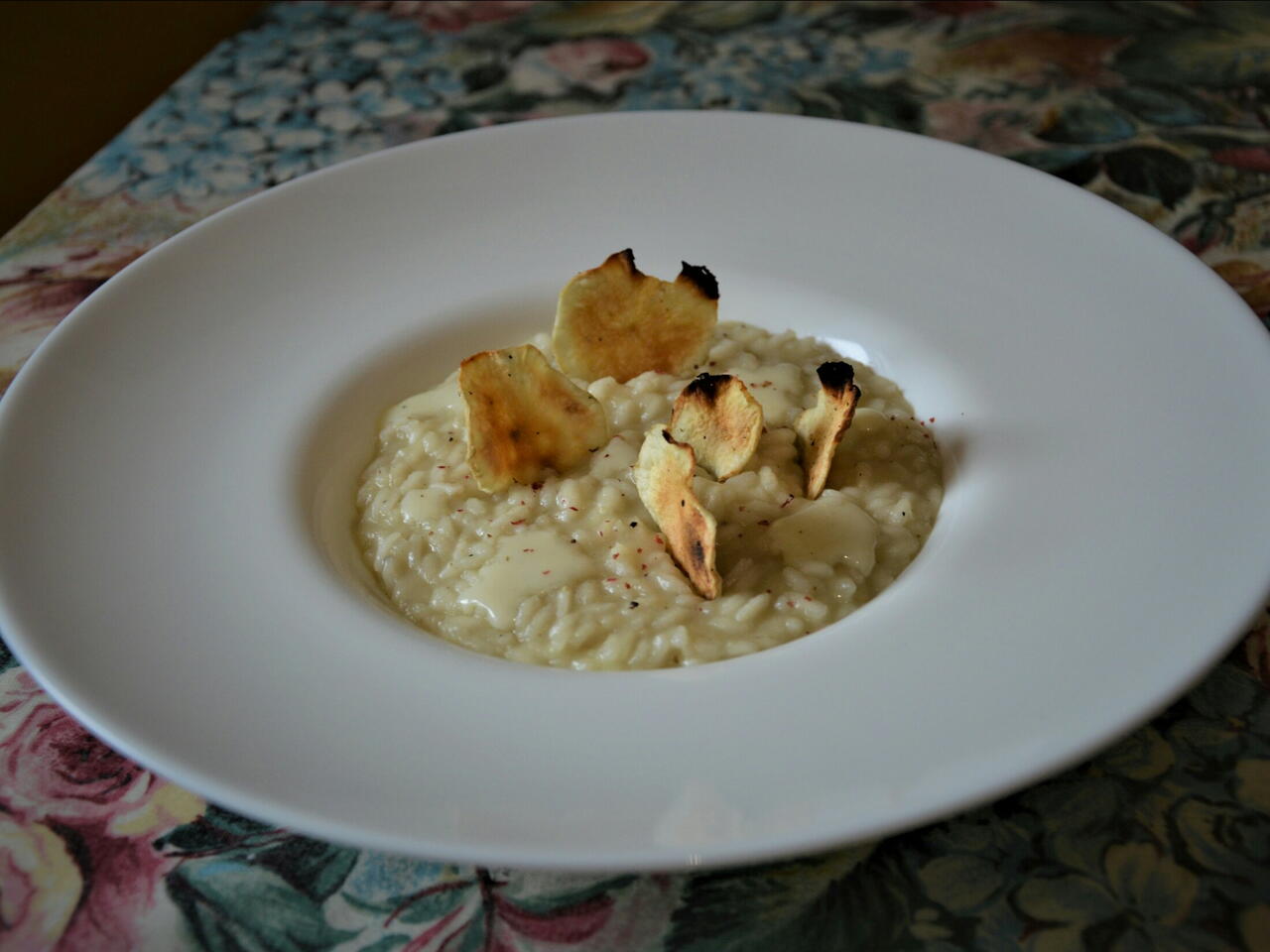 una volta calda prendere wok o padella profonda mettere olio e scalogno ,far soffriggere aggiungere riso e un goccio di vino bianco ,far sfumare, mettere sale pepe ,aggiungere.crema e poi l'acqua calda ,ogni volta che si asciuga aggiungere acqua finche il riso Γ¨ pronto ,prima che il riso Γ¨ pronto mettere le chips un po sciugate nel microonde fin quando si dorano bene ,devono risultare croccanti ,impiattare il riso con su le chips e qualche pezzettino di zola per contrasto