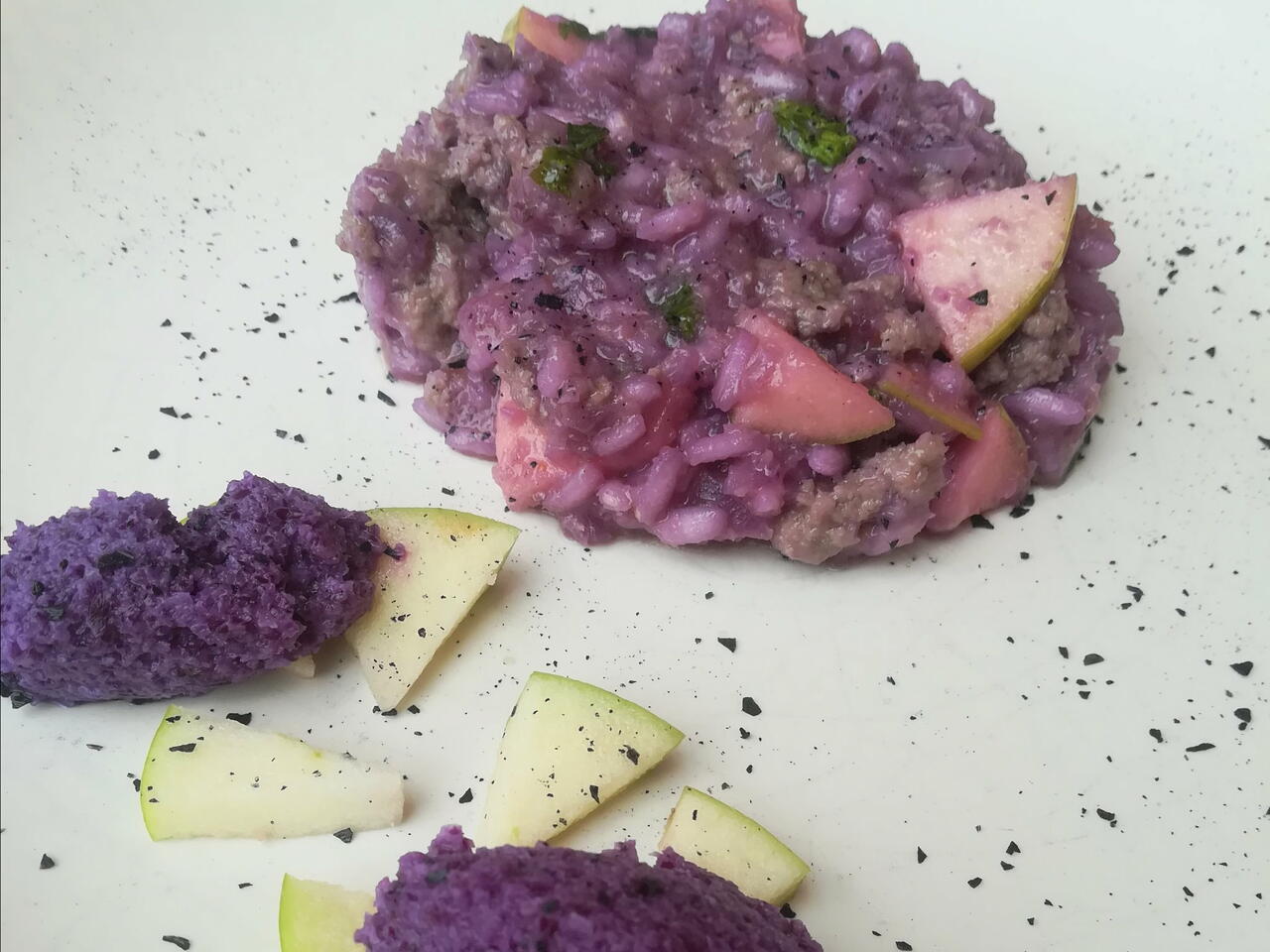 Risotto Viola Con Salsiccia e Mela Verde