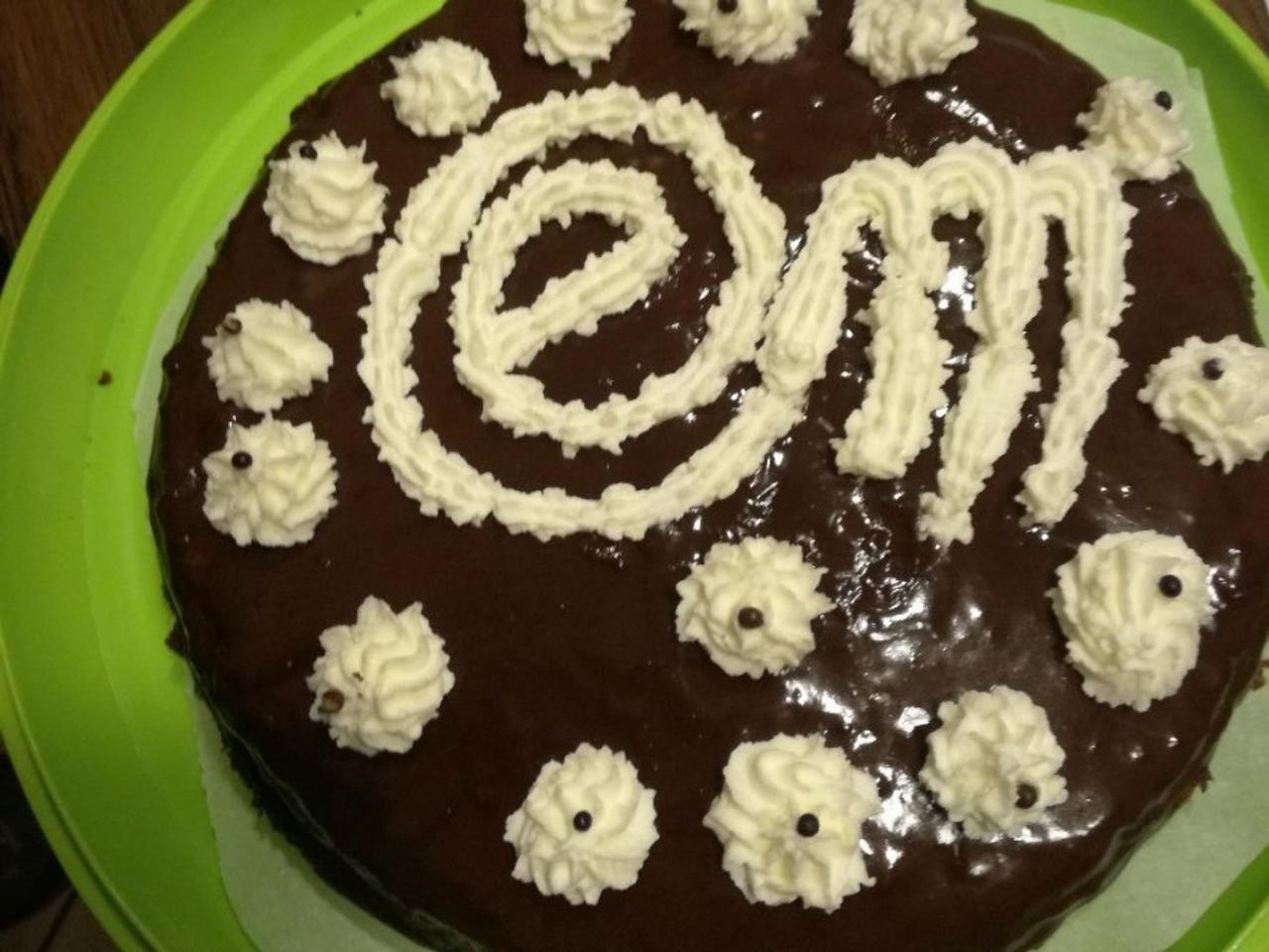 Tolta dal frigo non resta che decorarla(se si vuole). Io ad esempio, ho montato la panna avanzata, ho firmato il mio dolce e poi ho fatto dei decori intorno.