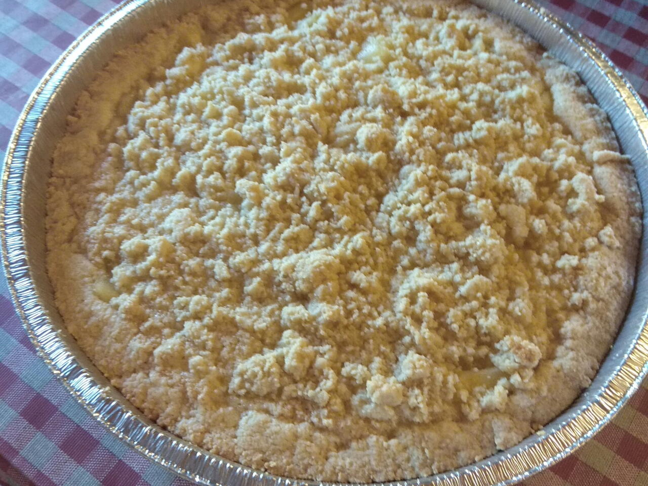 Preparare la base della torta con circa metร dell'impasto facendo anche leggermente dei bordi poi quando le mele sono tiepide trasferirle sulla base e livellare e aggiungere il resto del composto sulle mele lasciandolo sbricioloso