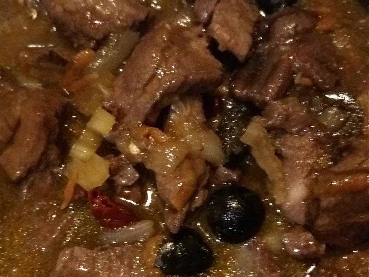 Adagiate ora i bocconcini di pecora sopra ...mescolate un po'...aggiungete anche 2 bei peperoncini piccanti...