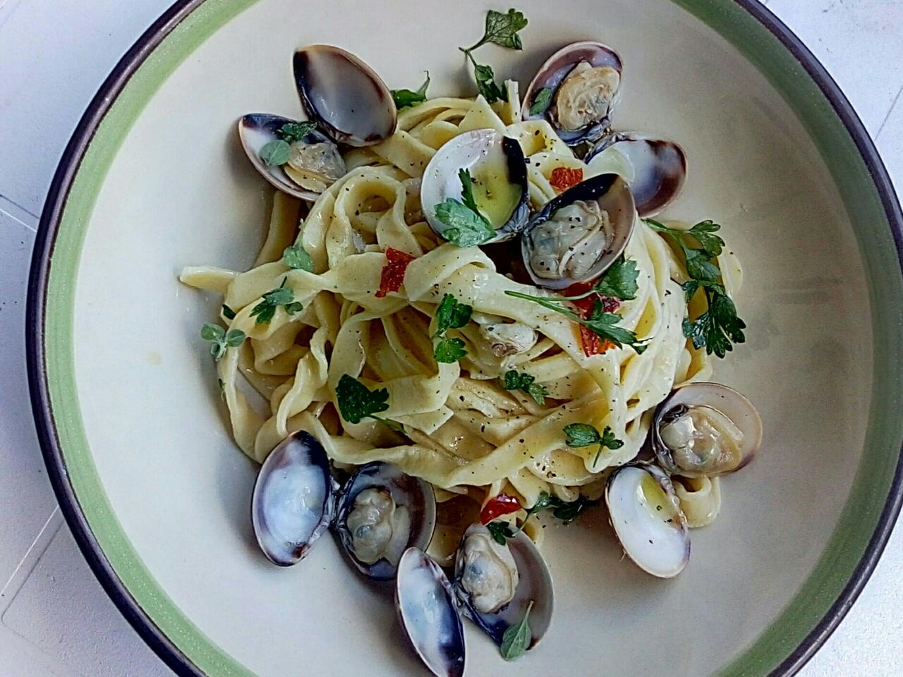 Mettere in una padella olio e aglio intero far inbrunire. Buttare dentro le vongole pulite, pepe e sale. Lasciare con coperchio fino ad apertura delle vongole.