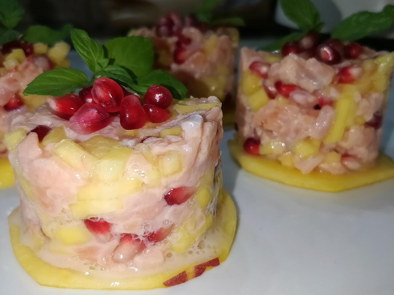 Riporre il salmone in una ciotola, aggiungere la mezza pesca e il mango tagliati anch'essi molto piccoli. Aggiungere olio, sale, limone e melograno pulito bene. Mescolare il tutto