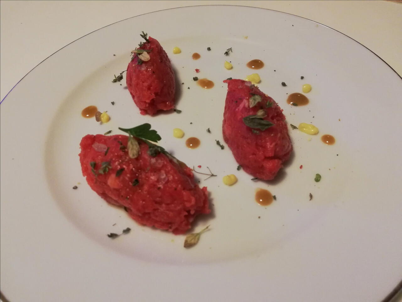 Prendere lo scamone tritare con un coltello fino a che non si raggiunge la grana voluta, mettere in una boul di vetro, aggiungere la scorza del limone grattugiata, salare e pepare a piacere, aggiungere infine il succo di limone. Lasciar marinare per circa 40 minuti coperta con pellicola alimentare.
