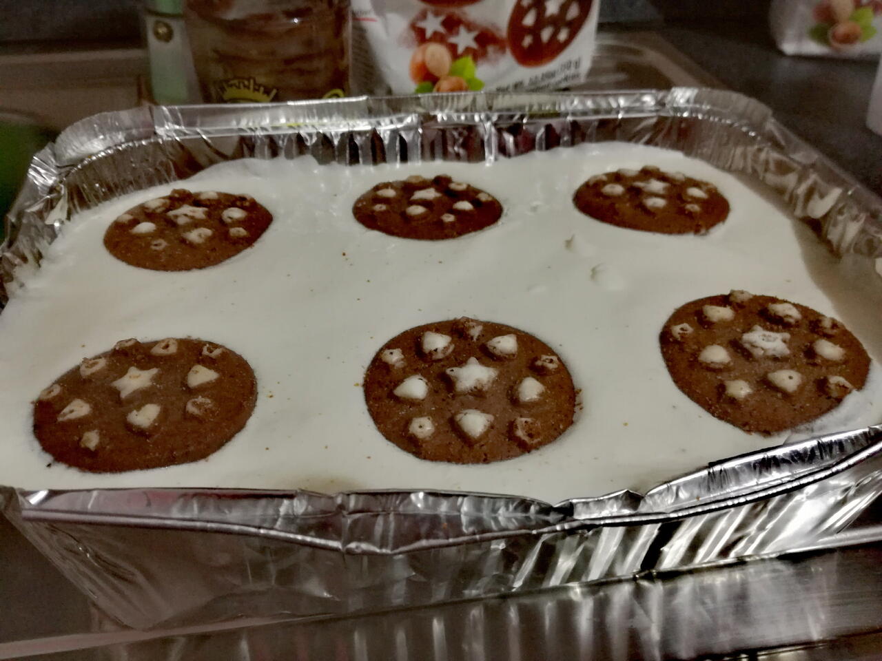 Ho inzuppato i biscotti nel latte e cacao e in una tortiera ho fatto uno strato di biscotti, poi uno strato di crema al cioccolato e poi un altro ancora di panna montata..ho ripetuto il tutto un altra volta e in superficie ho livellato la panna e ho aggiunto sei biscotti non bagnati.