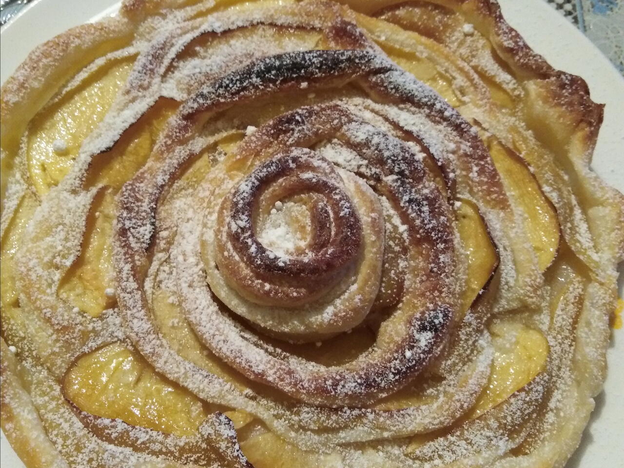 Il disco che abbiamo ricavato lo mettiamo nella tortiera con carta forno aggiungiamo la mela affettata finemente intorno al disco e poi un filo di pasta sfoglia fino a terminare tutta la mela e la sfoglia.Al centro arrotoliamo la pasta sfoglia.