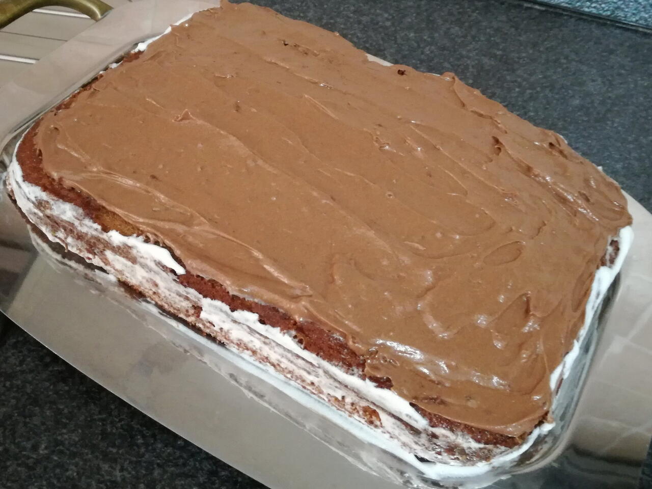 Spalmare anche la panna e chiudere con la parte superiore del pandispagna..poi mischiare la panna restante con nutella e mescolare per amalgamare i due ingredienti e infine spalmare in superficie e anche la parte bianca fuoriuscita dai lati della torta.