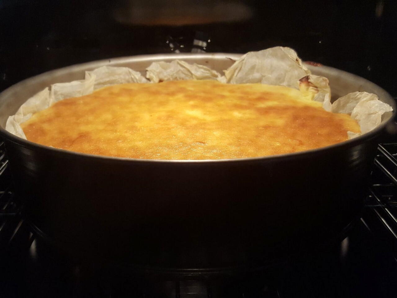Quando sarà ben cotta la base, versa prima tutto il ripieni di ricotta e poi il restante impasto della torta sopra.