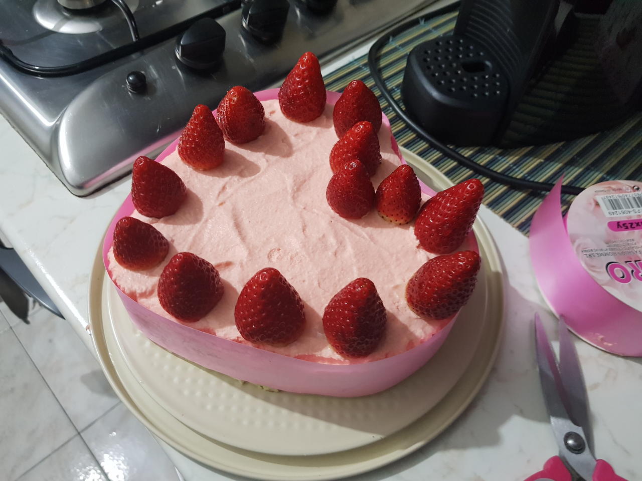Versarla in uno stampo con carta forno di almeno un centrimeto più piccolo rispetto alla torta che volete fare, io ne ho conservato una tazzina per la decorazione.Mettere in freezer e far congelare.