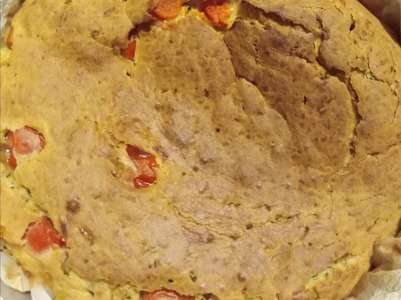Aggiungiamo infine la farina poco per volta e una bustina di lievito per torte salate. (Azioniamo di nuovo le fruste) . Aggiungiamo i pomodorini o qualche altro ingrediente.