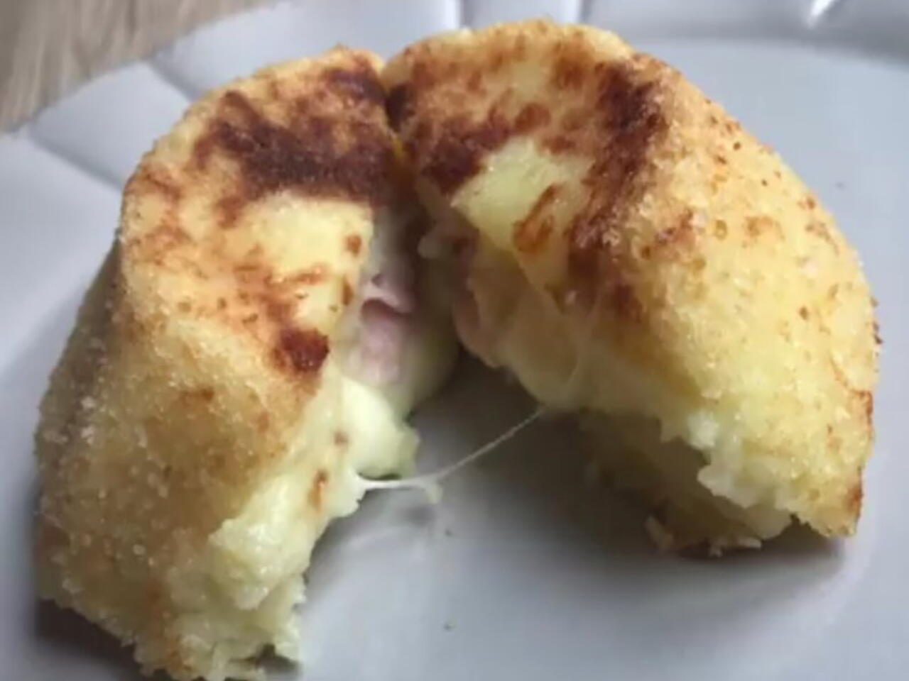 Inserite il composto e poco più della metà mettete un pezzetto di prosciutto un pezzo di scamorza e infine ancora un pezzetto di prosciutto.